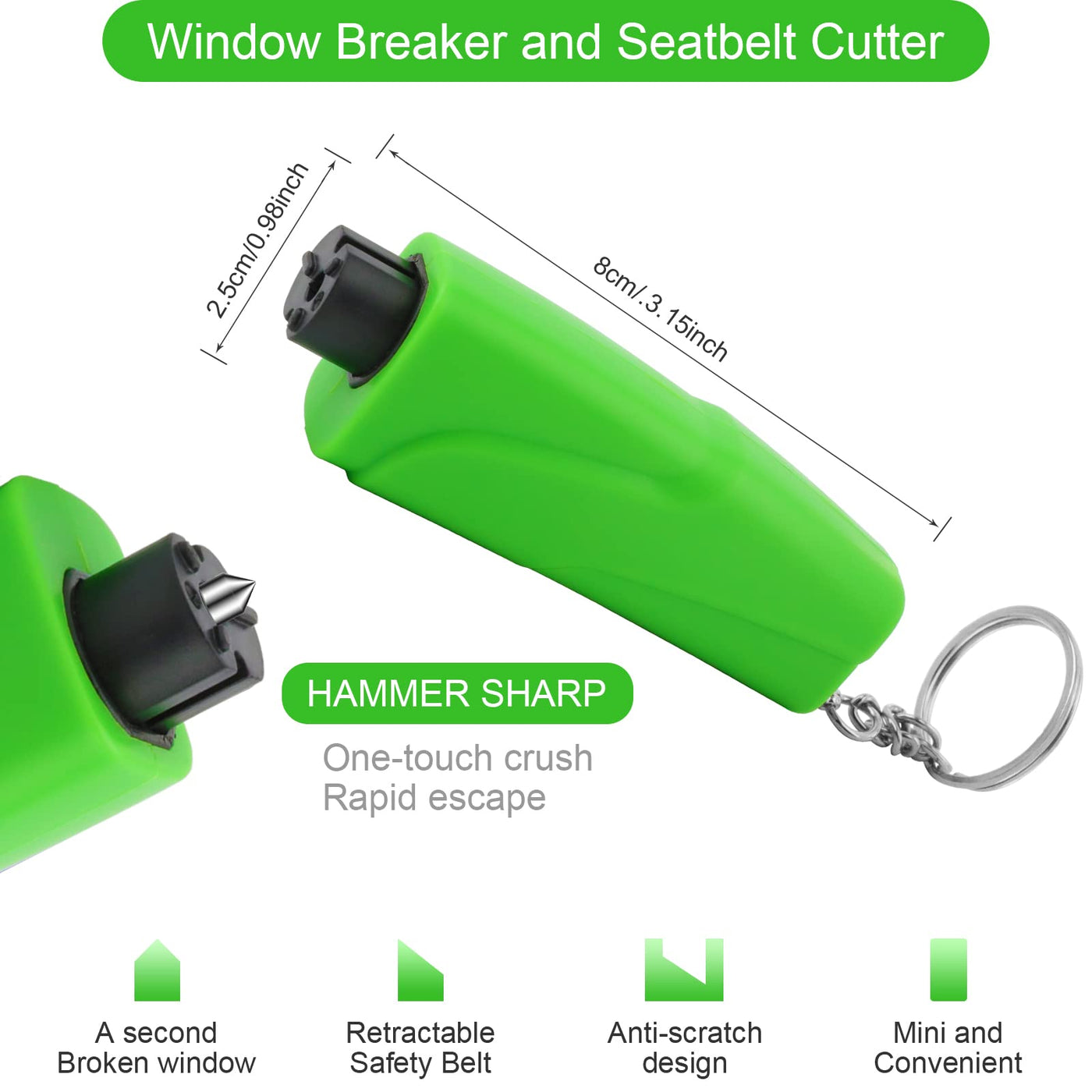 Function: 1.Suitable for various vehicles,the safety hammer is an ideal choice for daily travel and protection of life. 2.Car Safety Escape tool is designed to break tempered side windows fast & easily.A solid hammer head window breaker tool that can save your life when necessary. 3.Small and convenient,bright colors,it can be used as a keychain,and put it in your bag,or store it in the glove box,door pocket or armrest box,easy to carry,not take up space. 4.Car window breaker has been updated and upgraded for many generations.The upgraded spring mechanism generates a powerful punch that breaks the side windows (10mm max thickness) in seconds. Especially suitable for underwater escape,no fear of disturbed by water pressure and escape quickly in the water.