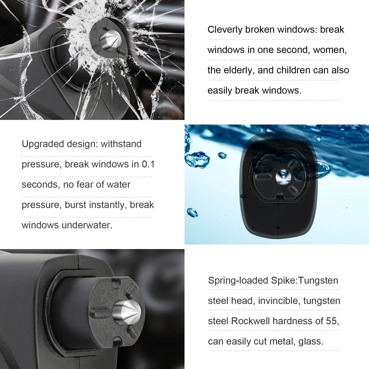 Q: What makes this window breaker suitable for underwater escape?A: The RAPUDA Window Breaker features an upgraded spring mechanism that helps generate a powerful punch to break windows quickly, making it effective even under water pressure, allowing for a rapid escape in aquatic emergencies.