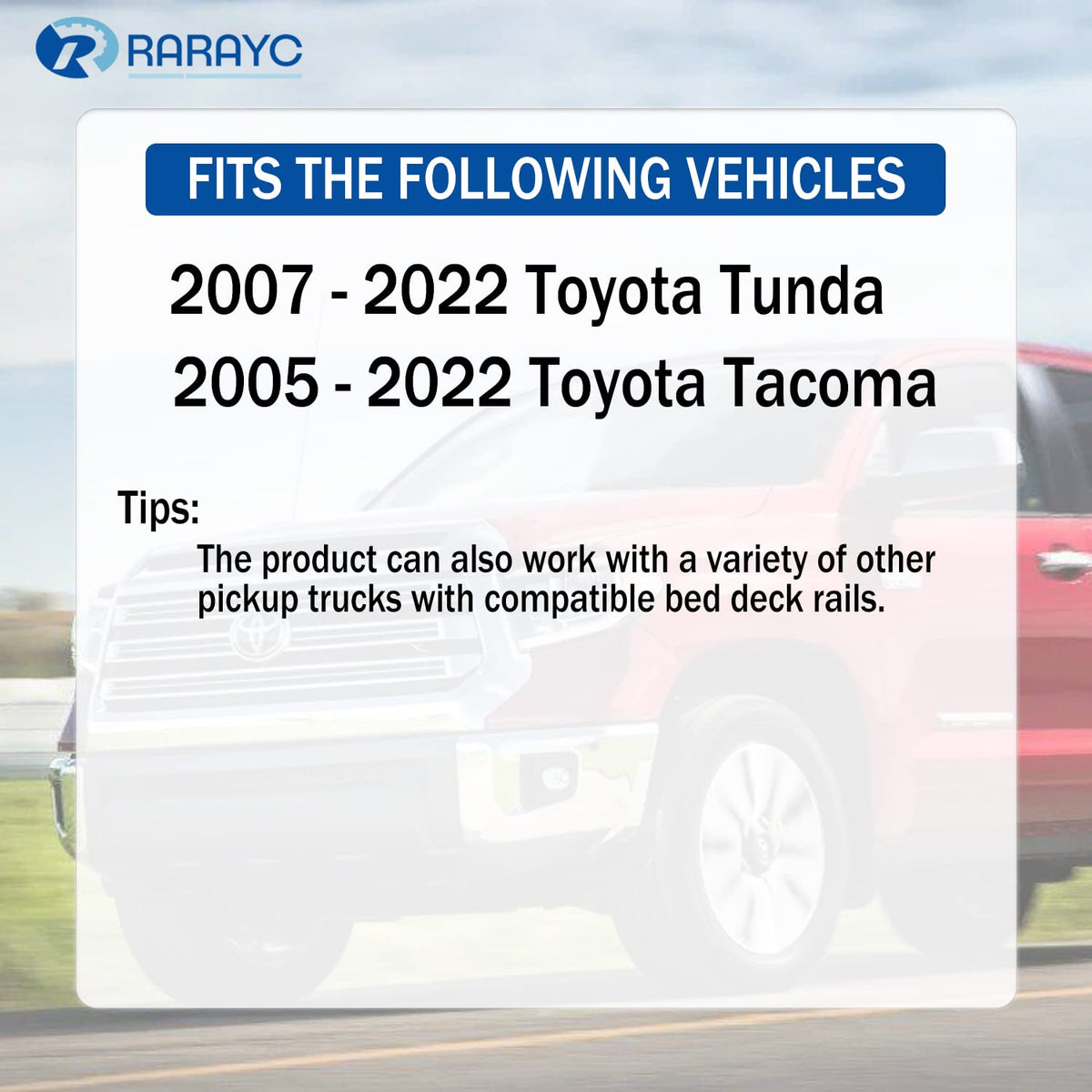 Q: What vehicles are compatible with the RARAYC Bed Rail Accessories?A: The RARAYC Bed Rail Accessories are specifically designed for Toyota Tacoma and Toyota Tundra models, and they can also fit other pickup trucks with compatible bed rails.