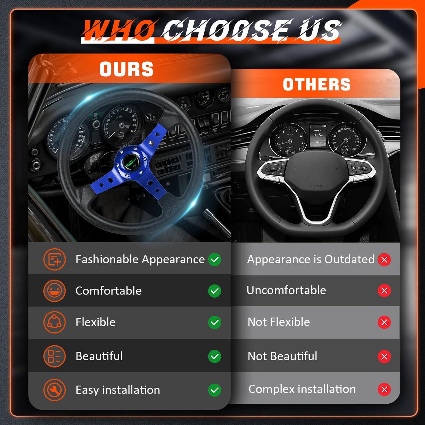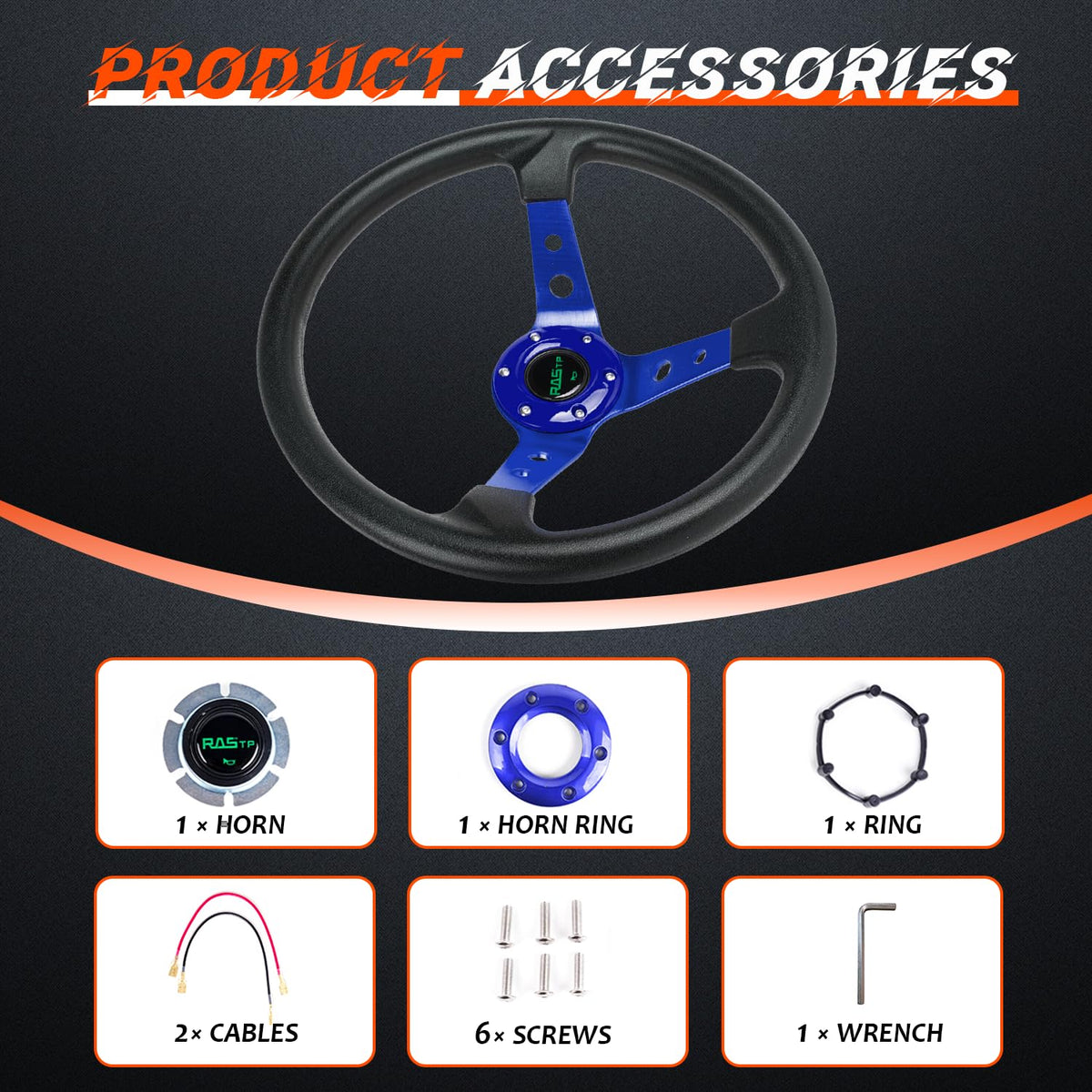 Universal Application - This racing steering wheel is compatible with most standard hub adapter, universal for most vehicle, racing car(TIPS: Hub adapter is NOT included, Before installation,please choose a Steering Wheel Hub Adapter that fits your car model) | Upgrade Material - Compared with the traditional leather material, Vinyl Leather has strong corrosion resistance, can withstand great impact, and better escort for you | Comfortable - This car steering wheel's aluminum steering wheel frame and wrapped with , Vinyl Leather,comfortable and durable | Fashionable & Exquisite Design - This universal steering wheel features fashionable and exquisite design, can enhances the appearance of your car's interior | Easy to Install - This racing steering wheel with horn comes with mounting screws and wrench, easy installation without modification