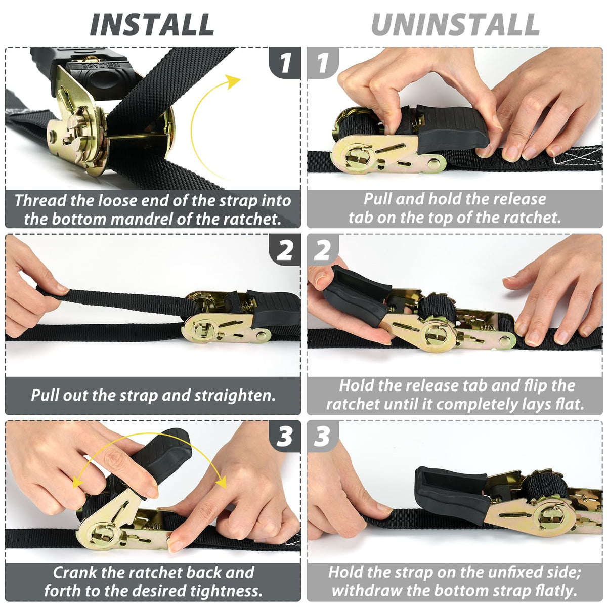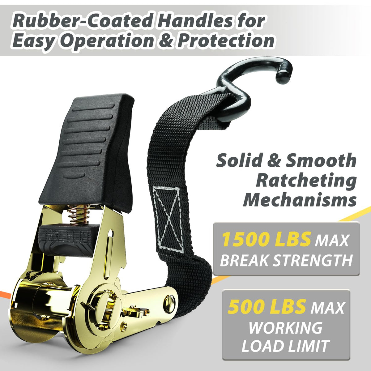 Q: What types of items can I secure with these ratchet straps?A: These high-quality ratchet straps are ideal for securing motorcycles, ATVs, scooters, sport bikes, vehicles, trucks, and other types of cargo.