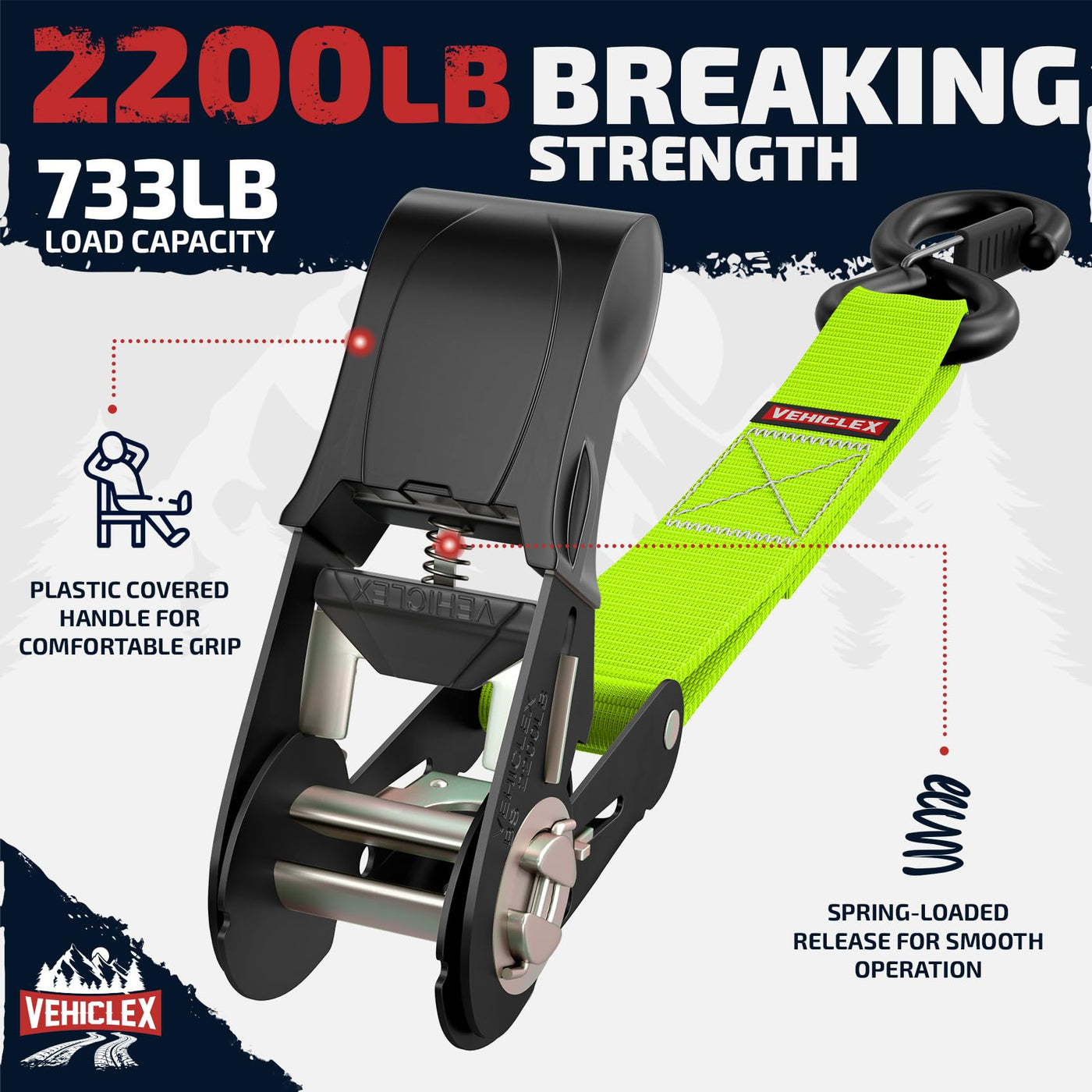 Q: What is the maximum weight capacity of the Ratchet Tie-Down Straps Set?A: The Ratchet Tie-Down Straps Set has a breaking strength of 2200lbs, making it suitable for securing heavy cargo such as ATVs, motorcycles, and kayaks.