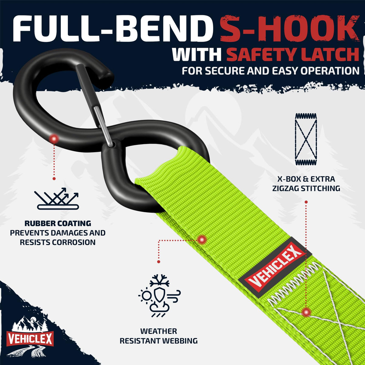 Safety And Convenience: A Vehiclex Promise Vehiclex Proudly Presents The Ultimate Solution For Secure Cargo Transport. Our 1-Inch Tie-Down Straps Come Up To A Wide Range Of Users, From Experts To Novices. Let'S Explore How Vehiclex'S Heavy-Duty Ratchet Straps Bring Safety And Convenience To Your Cargo Securing Needs. Enhanced Handling For Secure Cargo Vehiclex Ensures That Your Cargo Securing Experience Is Comfortable And Effective With Our Ergonomically Engineered Handle. Whether You'Re A Seasoned User Or A Beginner, This User-Friendly Handle Allows For Effortless Tension Adjustment. Durability And Reliability Built To Last The Strength Of Vehiclex'S Motorcycle Tie-Down Straps Lies In The Robust Webbing And The Reinforced Stitching. The 1-Inch Wide, 15 Feet Long Webbing Is Designed To Endure Heavy Loads, Ensuring Enduring Reliability For All Your Cargo Securing Needs. Secure And Reliable Attachment At Vehiclex, We'Ve Incorporated Rubber-Coated Full Bend S-Hooks, Providing A Solid And Reliable Attachment. These S-Hooks With Spring Loaded Clips Prioritize Security, Preventing Accidental Releases During Transit And Offering Unwavering Cargo Protection. Effortless Organization Complementing The Set Is A High-Quality Storage Bag From Vehiclex, Valued At $10. This Thoughtfully Designed Bag Is More Than An Accessory – It'S Your Key To Maintaining Organized And Tangle-Free Straps. Keeping Your Straps Ready For Use Has Never Been This Easy.