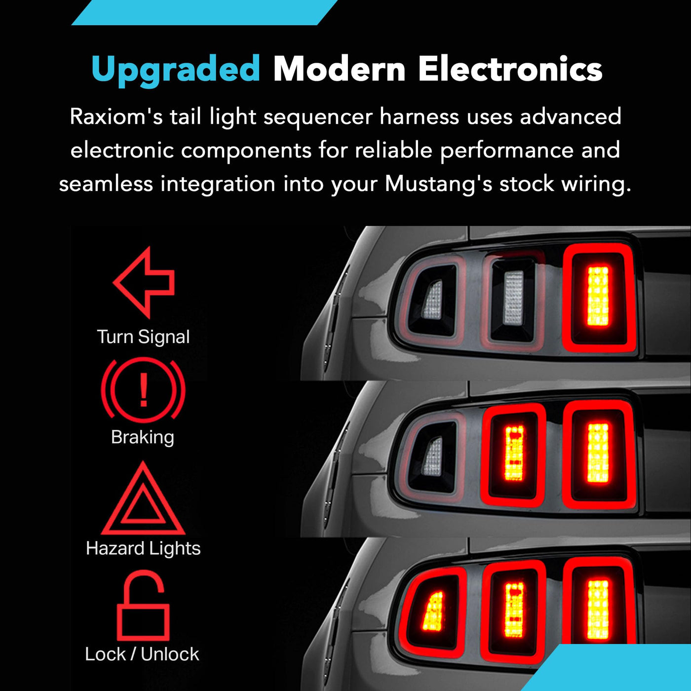 Upgrades Factory Tail Lights. Everyone loves the stock Sequential Tail Lights of the 2010-2023 Mustangs. They look fantastic, however the one minor issue is that they only sequence when used as turn signals. But Raxiom has solved this problem with their Plug-and-Play Tail Light Sequencer to add additional sequential modes.Additional Sequential Modes. When activated the turn signals or hazard lights will sequence from the center light out and repeat until switched off. When the car is locked/unlocked or when the brakes are applied, the tail lights will sequence once and then stay lit during braking.Modern Electronics. The Raxiom Sequential Tail Light Harness Kit is assembled from state of the art electronic components with a simple plug-in connector that easily insert into the stock wiring harness. This kit includes two inline unit harnesses, one for each side, that replace your factory harness.Easy Installation. The Raxiom Mustang Sequential Tail Light Harness Kit is a direct plug-in replacement for the stock wiring harness. Simply unplug the stock harness and plug in the new Raxiom sequential harness in it's place, it is that easy.Application. This Raxiom Tail Light Sequencer Harness Kit is designed to fit all 2010 to 2023 Mustangs including the V6, GT, BOSS and Shelby GT500 models.Please Note. This is a product designed for US models only. It will not function properly on Mustangs sold in the EU or UK without modifications being made to the wiring harness.