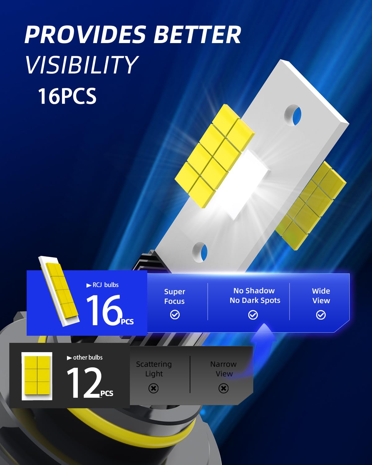 Rcj 9005/Hb3 Led Bulbs Superior Led Chips - Rcj 9005 Led Bulb With Custom Csp Chip, 100W 30,000Lm In Total, 600% Brighter Than Halogen Bulbs. Adjustable Beam - These Bulbs Are Equipped With High-End 16 Csp Chip On Both Sides. No Dark Spots Or Foggy Light, No Dazzling Of Oncoming Traffic. Easy Installation - Almost 1:1 Miniature Design As Halogen Bulb, Easy To Install Within 10 Minutes Without Any Modification. Efficient Cooling System - Uses Aluminium'S Thermal Conductivity, Hollow-Cut Heat Sink And 15,000 Rpm Turbofan Design To Promptly Dissipate The Heat And Ensure The Life Of The Led Bulbs. Ip67 Waterproof - Can Be Used In Low Visibility And Severe Weather Conditions Such As Fog, Rain, Snow, Dust, Etc.
