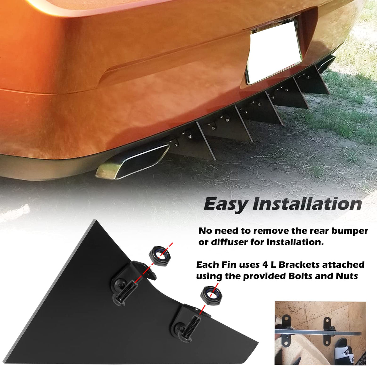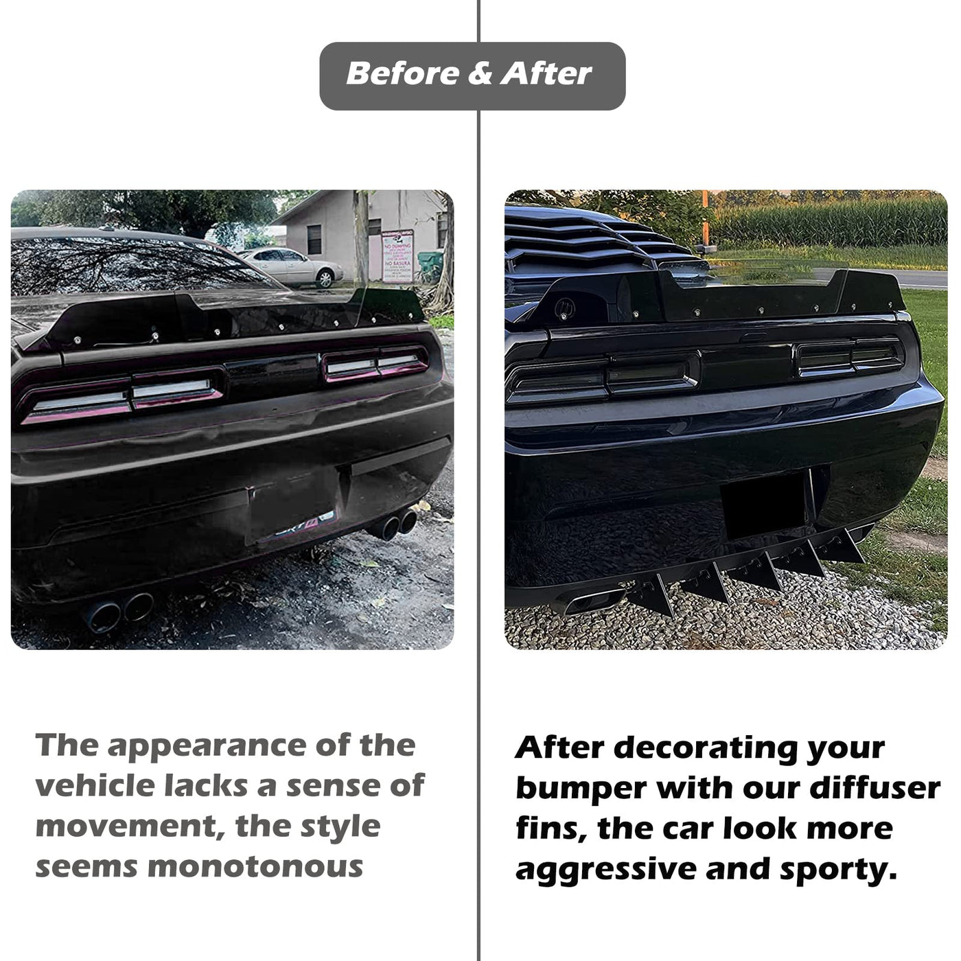 5 pieces Full Rear Diffuser Kit is designed for Dodge Challenger SXT, SRT, RT, Hellcat 2009 2010 2011 2012 2013 2014 stock rear bumper. Rear Bumper Diffusers are designed to improve energy-saving, increase downforce and better stability at high speeds. Holes need to be drilled in the rear bumper for installation, without removing the rear bumper or diffuser.