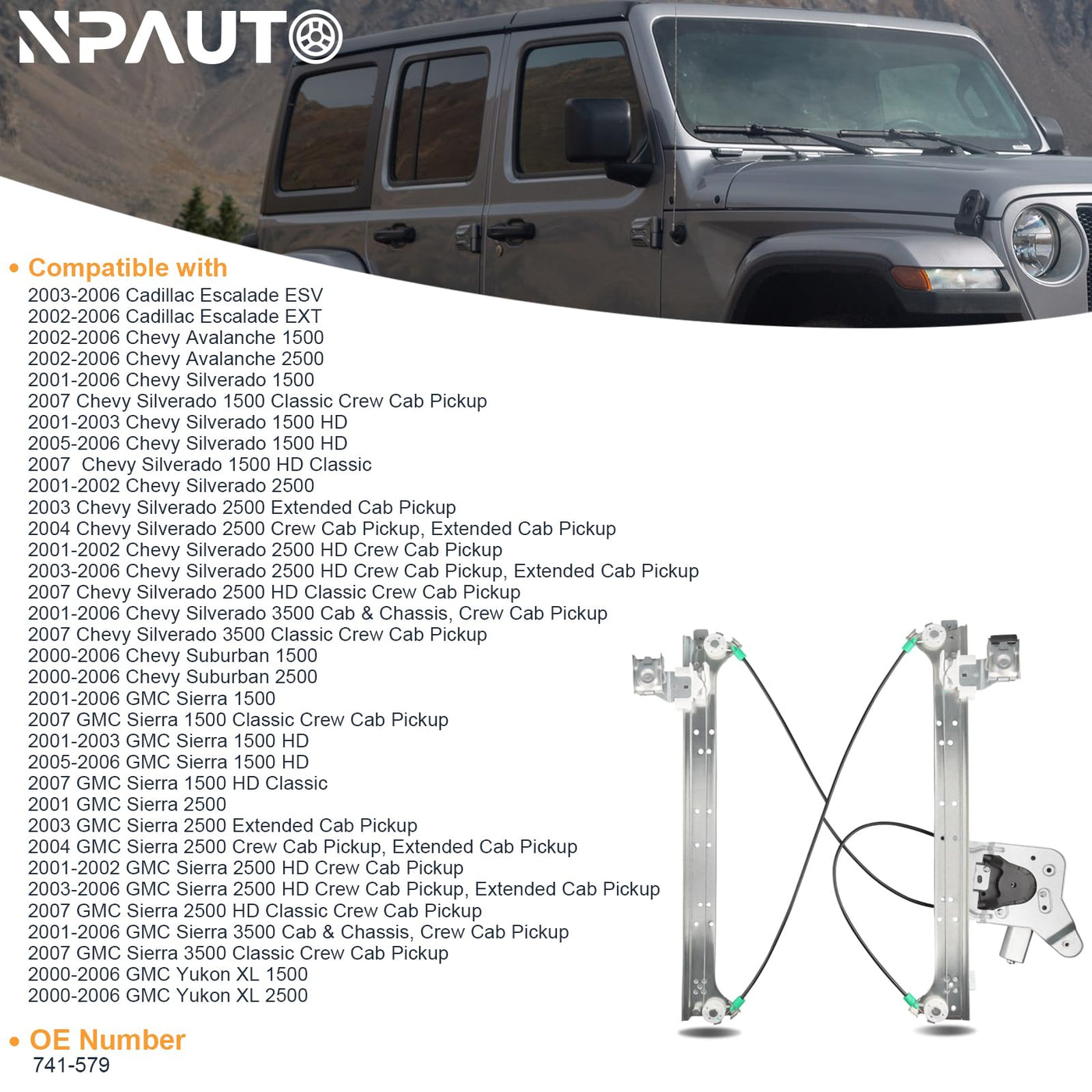 Q: What vehicles are compatible with the Rear Passenger Side Power Window Regulator?A: This power window regulator is compatible with 2000-2006 Chevy Silverado (1500, 2500, 3500), 2000-2006 Chevy Suburban, 2002-2006 Chevy Avalanche, 2001-2006 GMC Sierra (1500, 2500, 3500), 2000-2006 GMC Yukon XL, and 2002-2006 Cadillac Escalade (EXT, ESV).