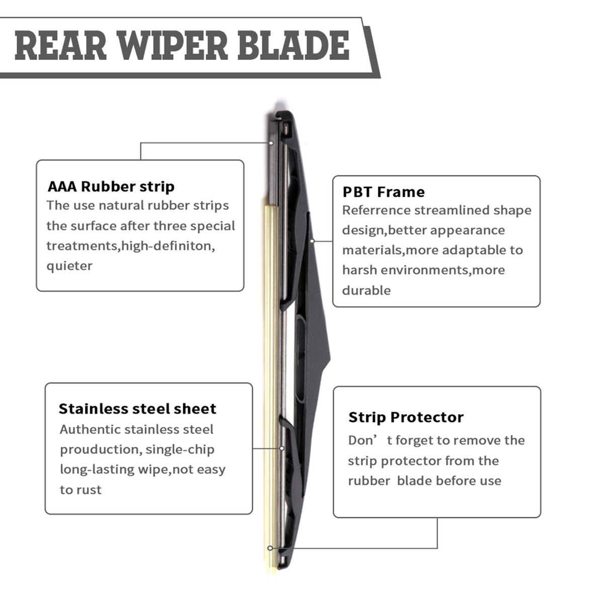 Q: What materials are used in this rear wiper arm and blade?A: The rear wiper arm and blade are made from durable 304H steel and natural rubber, ensuring weather resistance and longevity.