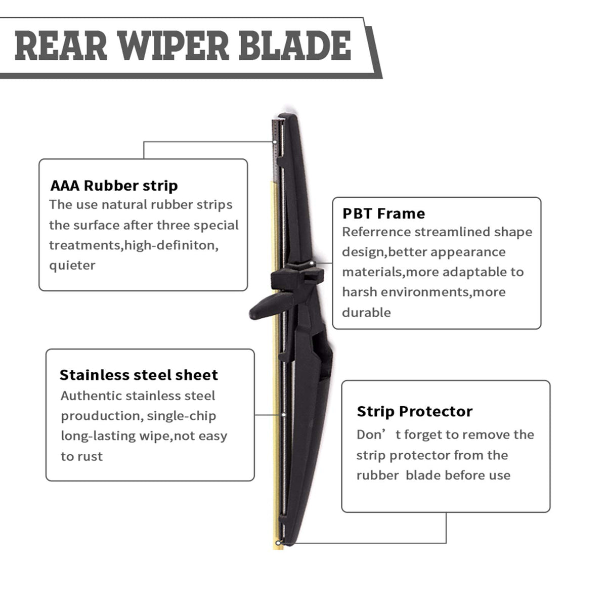 Q: How long is the rear wiper arm and blade included in the set?A: The rear wiper arm length is 372MM, and the rear wiper blade length is 315MM, which are designed to fit perfectly on your vehicle's rear windshield.