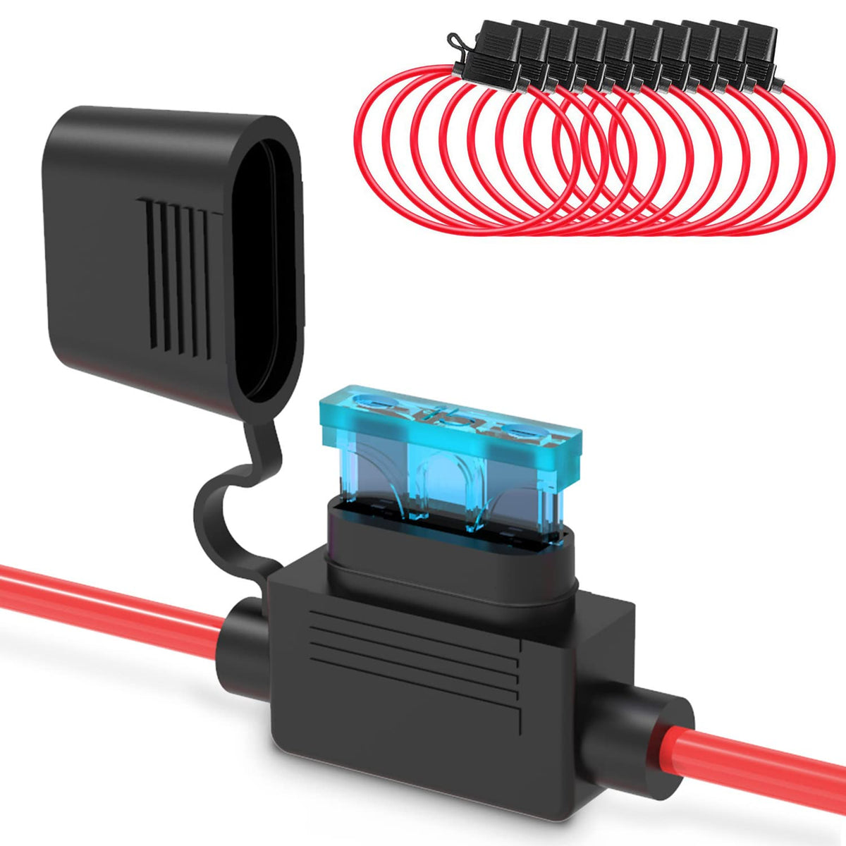 ATC/ATO in-line fuseholder | Heavy duty 12AWG red power wire, Protecting circuits and electrical equipment | Tight-fitting waterproof lid for moisture-proof, waterproof performance and dust proof. | Fuse holders wire is made of pure Oxygen Free Copper as conductor to ensure its excellent electrical conductivity. | Package include: 10 x Inline holder, 10 x 15A fuse, 10 x 20A fuse
