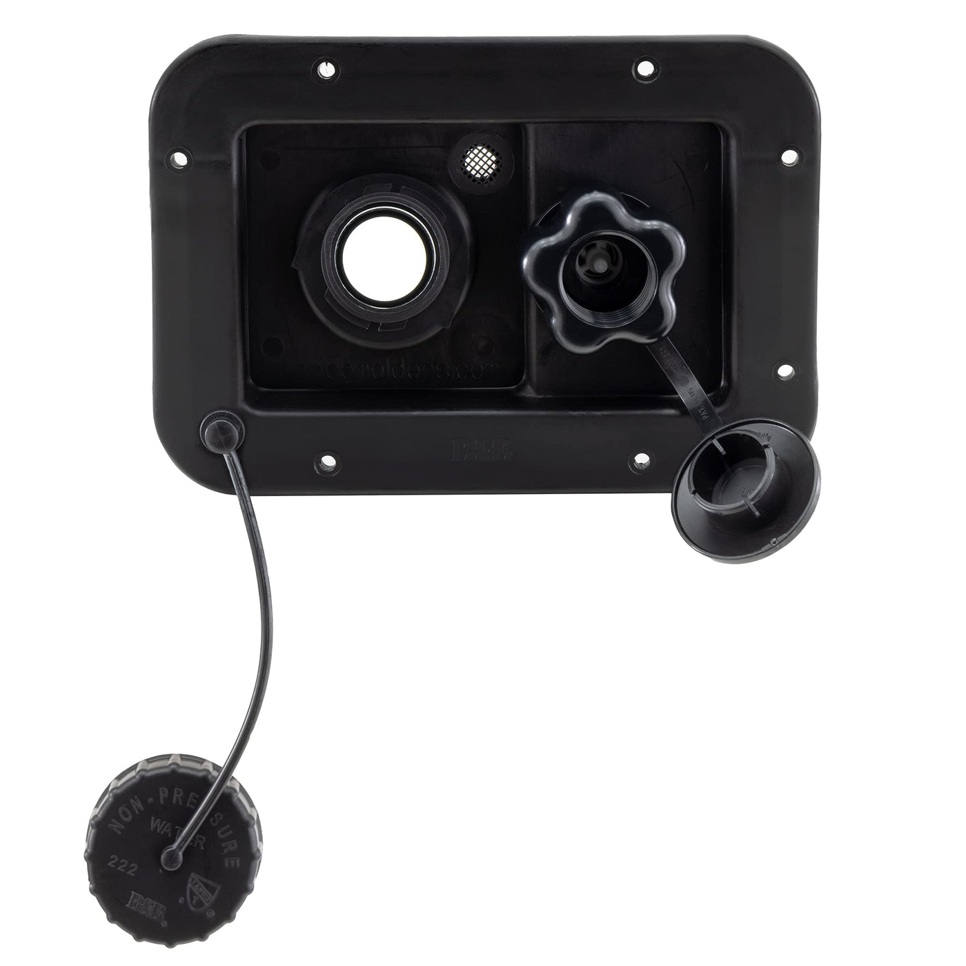 This RV water fill station includes both a city water fill and a gravity water fill station. Altogether, it measures 7 1/2 wide by 5 3/8 high by 4 deep and requires a cutout of 6 wide by 3 3/4 high. It is available in both black and white and is made of a sturdy and durable plastic construction that not only keeps up over time but also doesn't add any extra weight to your rig. The city water fill has a brass valve to secure a standard hose to the end. Easy to install, it has 8 pre-drilled installation screw holes on the outer rim of the unit. Details: RV Water Fill Station Includes city water fill and gravity water fill Dimensions: 7 1/2 W x 5 3/8 H x 4 D Cutout Dimensions: 6 W x 3 3/4 H Black has plastic check valve while white has brass check valve Colors: Black, White Material: Durable plastic Mesh vent for ventilation Brass valve on city water fill City water fill able to connect to standard garden hose Easy to install Includes 8 pre-drilled installation holes City water fill connection size: 3/4 on exterior and 1/2 on interior Gravity water fill connection size: 1 1/4 and 1 1/2 fill hose