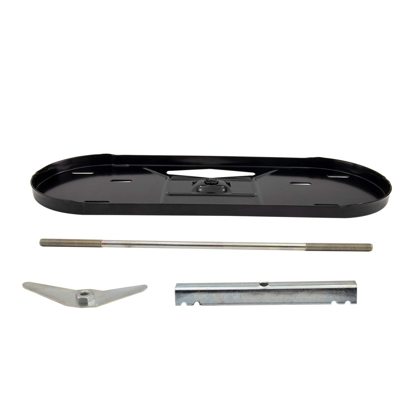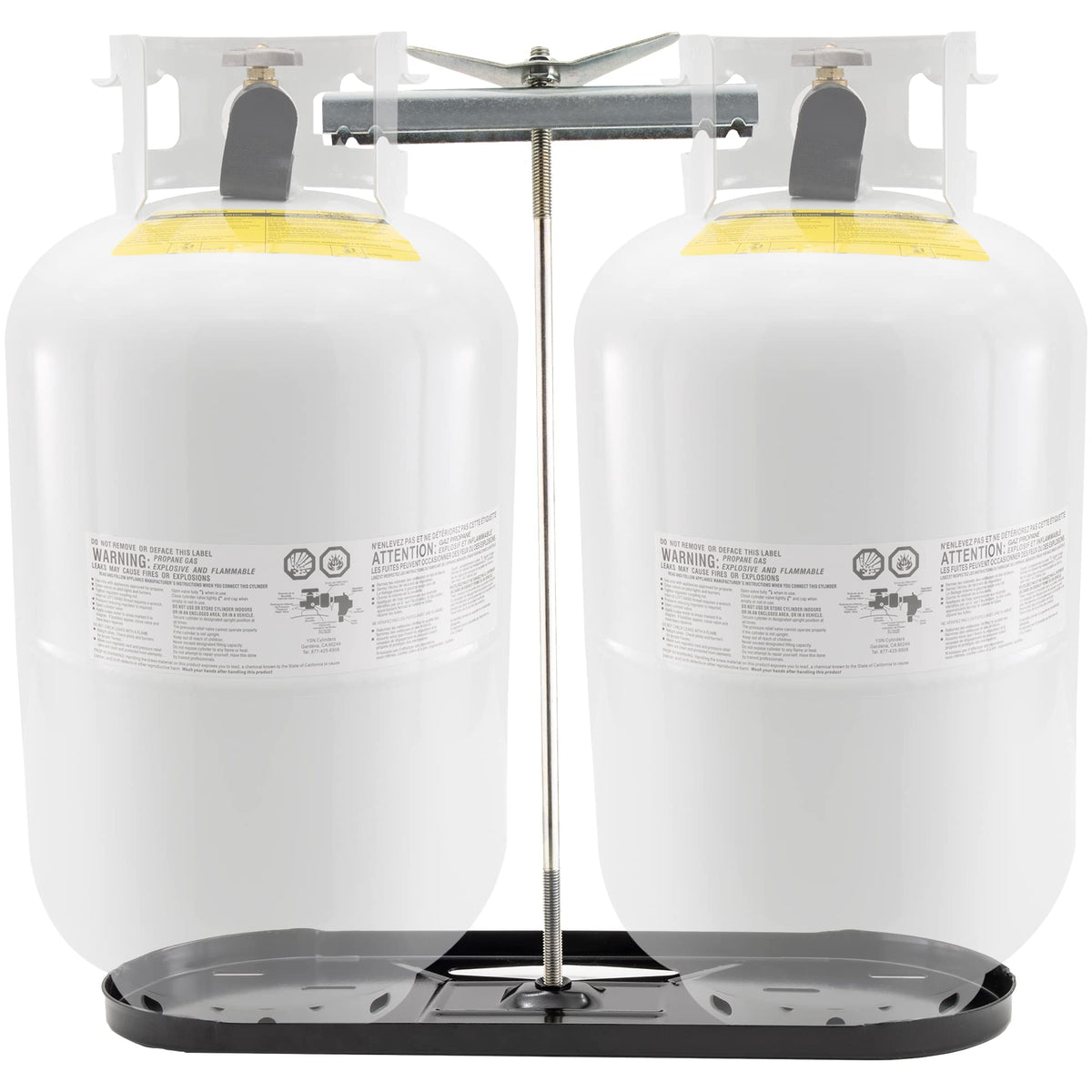 Details: RV Propane Tank Mounting kit Securely holds two 20 or 30 pound propane tanks Fast and easy to use Bottom tray, vertical bar, securing wing, and connecting bar Powder-coated steel construction Durable Rust-resistant Weight: 9 lb Dimensions: 23 5/8''W x 8 1/2''D overall Rod size: 17'' for 20-pound kit and 23'' for 30-pound kit Tanks, regulator, and pigtails not included