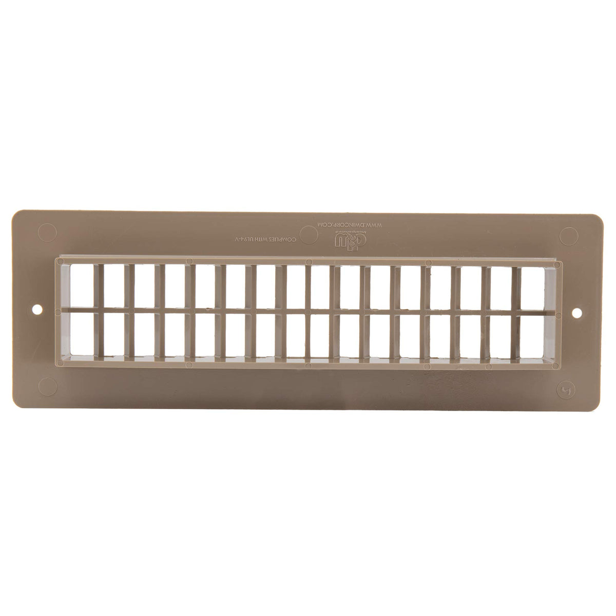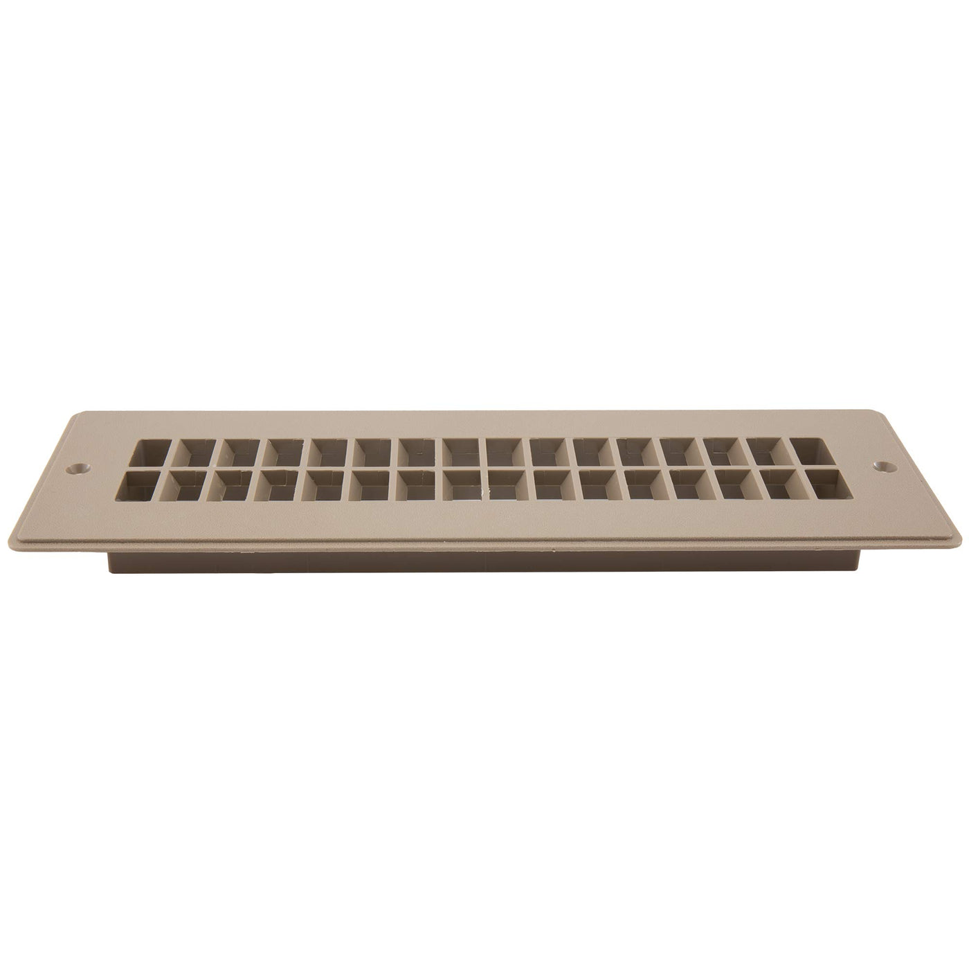 Details: Stationary Vent Cover Dimensions: 4'' x 12'' x 1'' Cutout dimensions: 2-1/4'' x 10-1/8'' Non-adjustable; fixed stationary vent cover Plastic composite construction Colors: Black, Beige Easy installation Two screw holes Screws not included Made in America