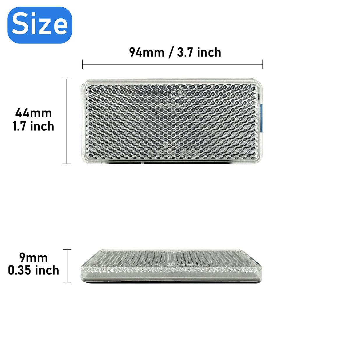 Q: What are the dimensions of the Reflector Self Adhesive Rectangle?A: The dimensions of the Reflector Self Adhesive Rectangle are 94 x 44 mm, which is approximately 3.7 x 1.7 inches.
