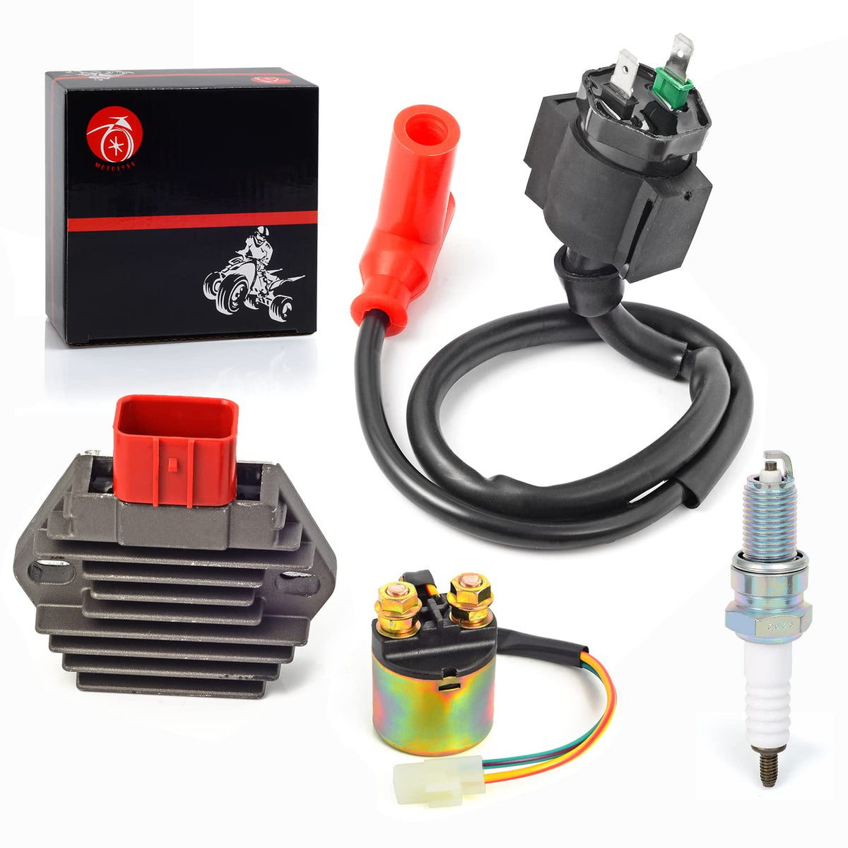 Q: What does the package include in the ignition coil kit?A: The package includes one Regulator Rectifier, one Ignition Coil, one Spark Plug, and one Relay, providing all essential components for your ignition system.