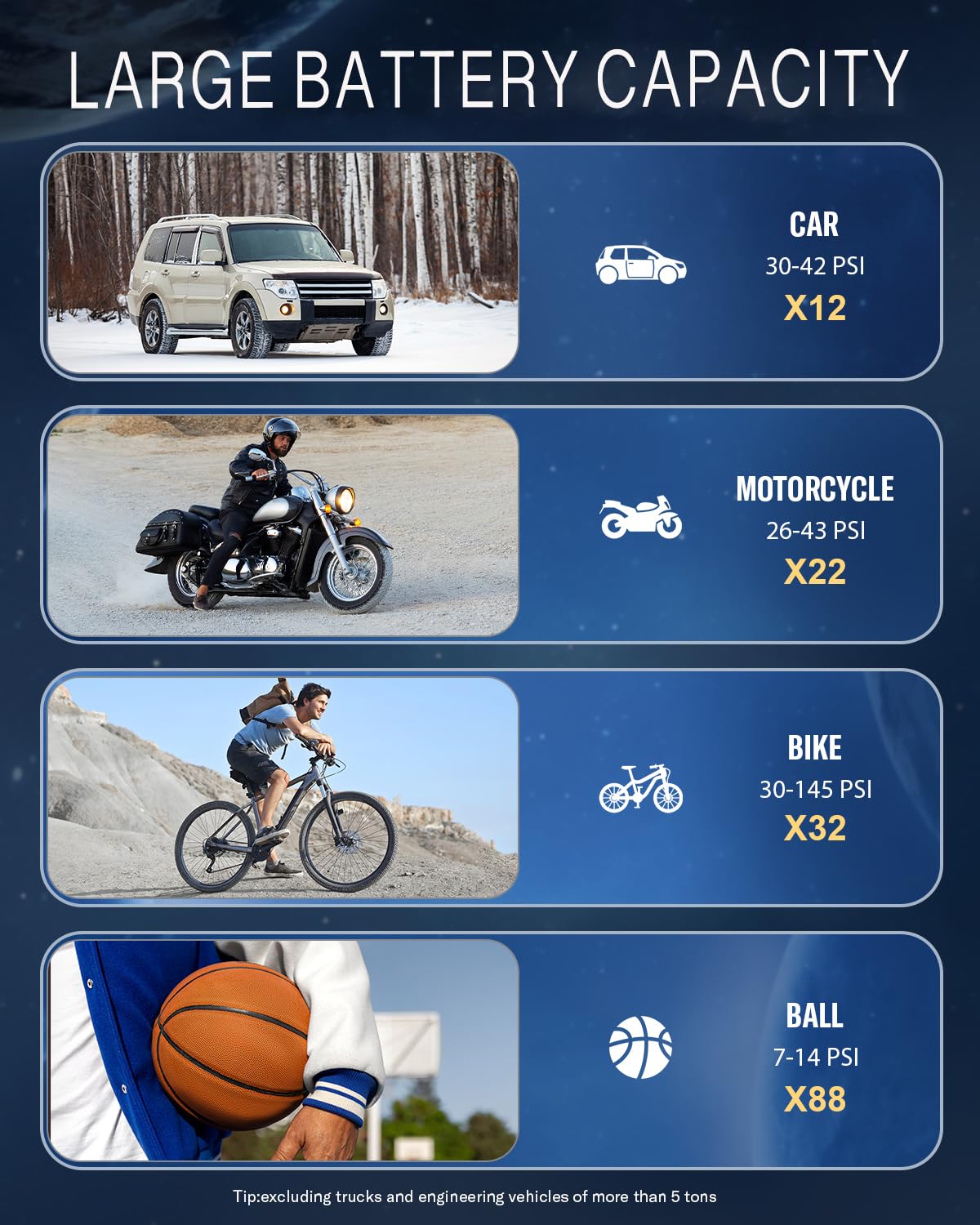 Q: What safety features does the Q7 tire inflator have regarding its battery?A: The Q7 tire inflator features a lithium-ion battery, which is packed securely within the equipment, ensuring safe operation during use and storage.