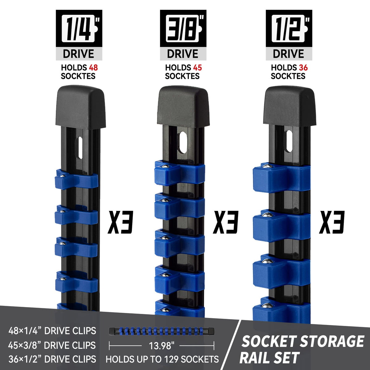 Q: What socket sizes do the holders support?A: The socket holders in this kit are designed for 1/4-inch (48 clips), 3/8-inch (45 clips), and 1/2-inch (36 clips) sockets, providing versatility for different tools.