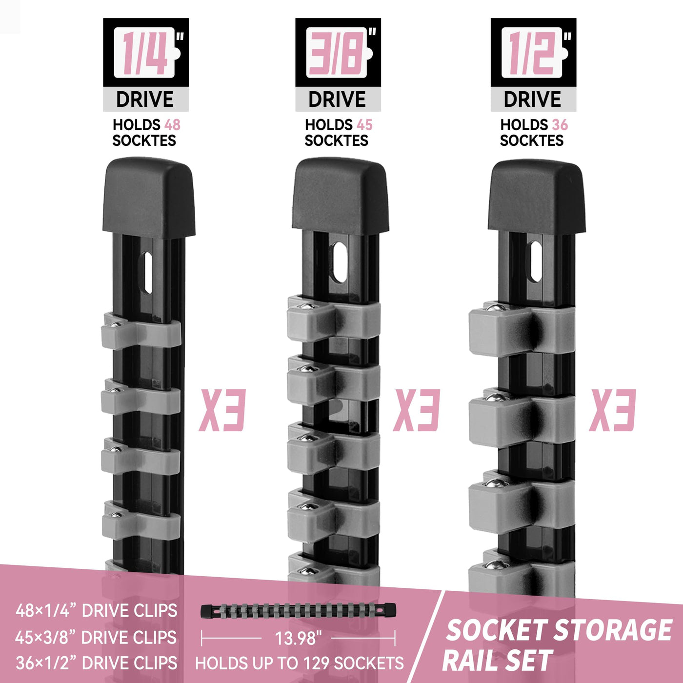Q: What sizes of sockets can I use with the Reniteco Socket Organizer?A: The Reniteco Socket Organizer is designed to accommodate both SAE (Inch) and metric sizes. It includes clips for 1/4-inch (48 clips), 3/8-inch (45 clips), and 1/2-inch (36 clips) sockets, making it compatible with a wide range of socket brands.