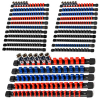 Q: How can I easily identify sockets in the organizer?A: The socket organizer features color-coded clips in blue, red, and black, allowing you to quickly and easily identify SAE and metric sockets.