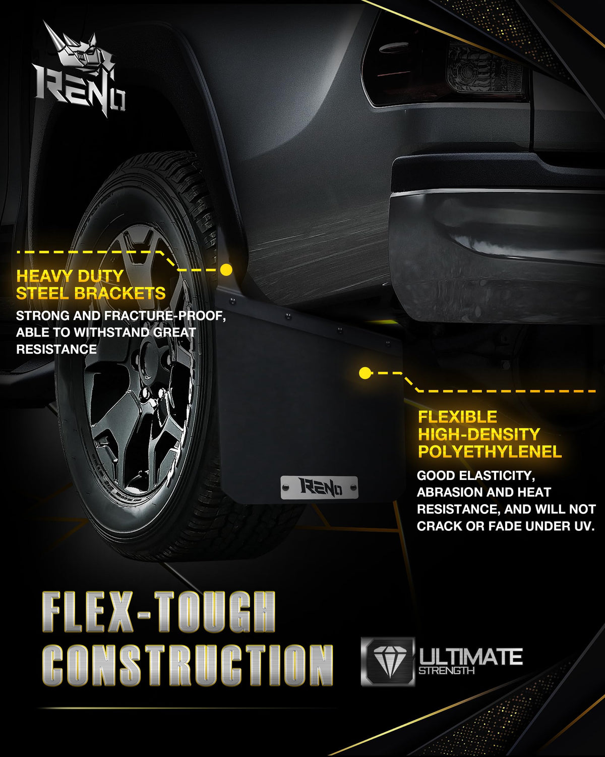 RENO Mud Flaps, Driver + Passenger Sides Splash Guards Heavy Duty Vehicle Sediment Protection Compatible with Universal Off-Road