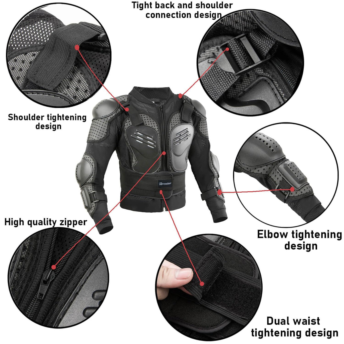 Q: What materials are used in the construction of the motorcycle jacket?A: The jacket is made from a breathable soft mesh fabric, which ensures comfort during use. It also features a thickened PP shell that effectively protects the child's back, chest, shoulders, and elbows from impacts.