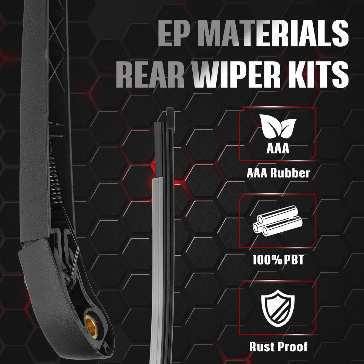 Q: What material is used in this wiper blade and arm?A: The rear wiper arm and blade are made from high-quality materials, including 100% PBT with 30% Pb, ABS, and rubber, which ensures durability and effective performance in keeping your rear windshield clear of water and debris.