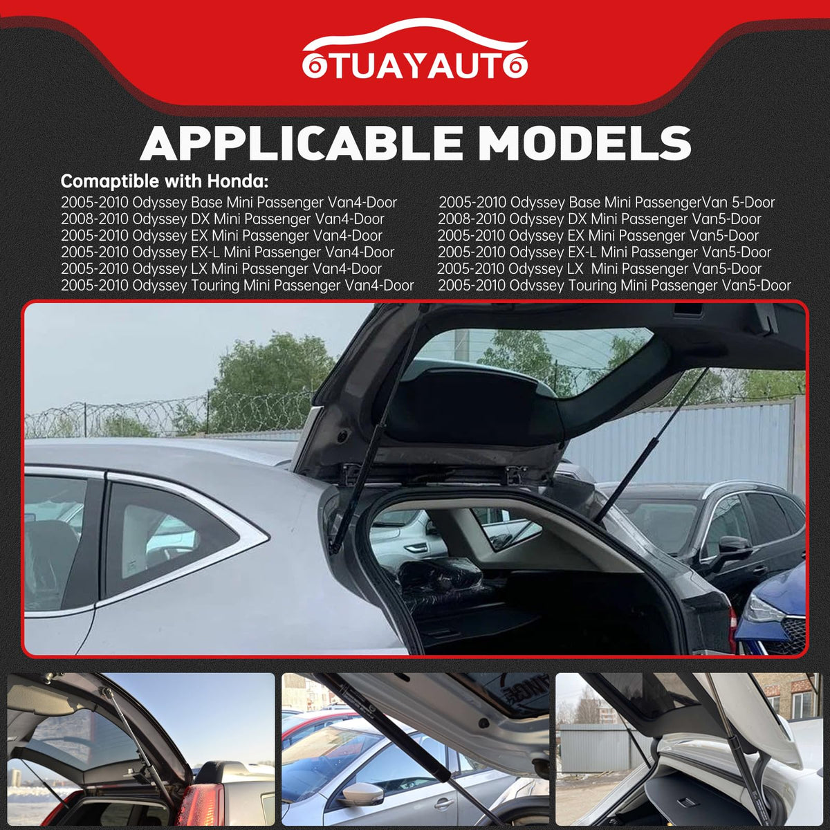OTUAYAUTO Parts & Accessories When you want to get OEM quality without the high dealer cost, OTUAYAUTO is the right choice for you. Today you can fix your vehicle properly and have money left in your pocket with a OTUAYAUTO product. Advanced Lift Supports Fitment: Compatible with 2005-2010 Honda Odyssey Base Mini Passenger Van 4-Door Compatible with 2005-2010 Honda Odyssey Base Mini Passenger Van 5-Door Compatible with 2008-2010 Honda Odyssey DX Mini Passenger Van 4-Door Compatible with 2008-2010 Honda Odyssey DX Mini Passenger Van 5-Door Compatible with 2005-2010 Honda Odyssey EX Mini Passenger Van 4-Door Compatible with 2005-2010 Honda Odyssey EX Mini Passenger Van 5-Door Compatible with 2005-2010 Honda Odyssey EX-L Mini Passenger Van 4-Door Compatible with 2005-2010 Honda Odyssey EX-L Mini Passenger Van 5-Door Compatible with 2005-2010 Honda Odyssey LX Mini Passenger Van 4-Door Compatible with 2005-2010 Honda Odyssey LX Mini Passenger Van 5-Door Compatible with 2005-2010 Honda Odyssey Touring Mini Passenger Van 4-Door Compatible with 2005-2010 Honda Odyssey Touring Mini Passenger Van 5-Door Notice 1. Is there a certain direction for lift supports to be mounted? (i.e. shaft up or shaft down ?) 2. The new lift support must be installed in the same position as the old one, do not scratch the chrome rod. 3. Please refer to parts finder tool to insure fitment - select your vehicle's year make and model to make sure fits.