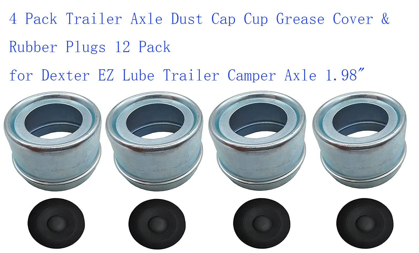4 Pack Trailer Axle Dust Cap Cup Grease Cover & Rubber Plugs 12 Pack For Dexter Ez Lube Trailer Camper Axle 1.98'' . Fits Standard Brake & Idler Trailer Axles For Most 4 Lug & 5 Lug Axles With 1.98'' Diameter Cap. Standard 2000#-3500# Axle Dust Covers With Plugs Included For Both Types Of Axles Ez Lube And Standard. A Brand-New, Unused, Unopened, Undamaged Item In Its Original Packaging.
