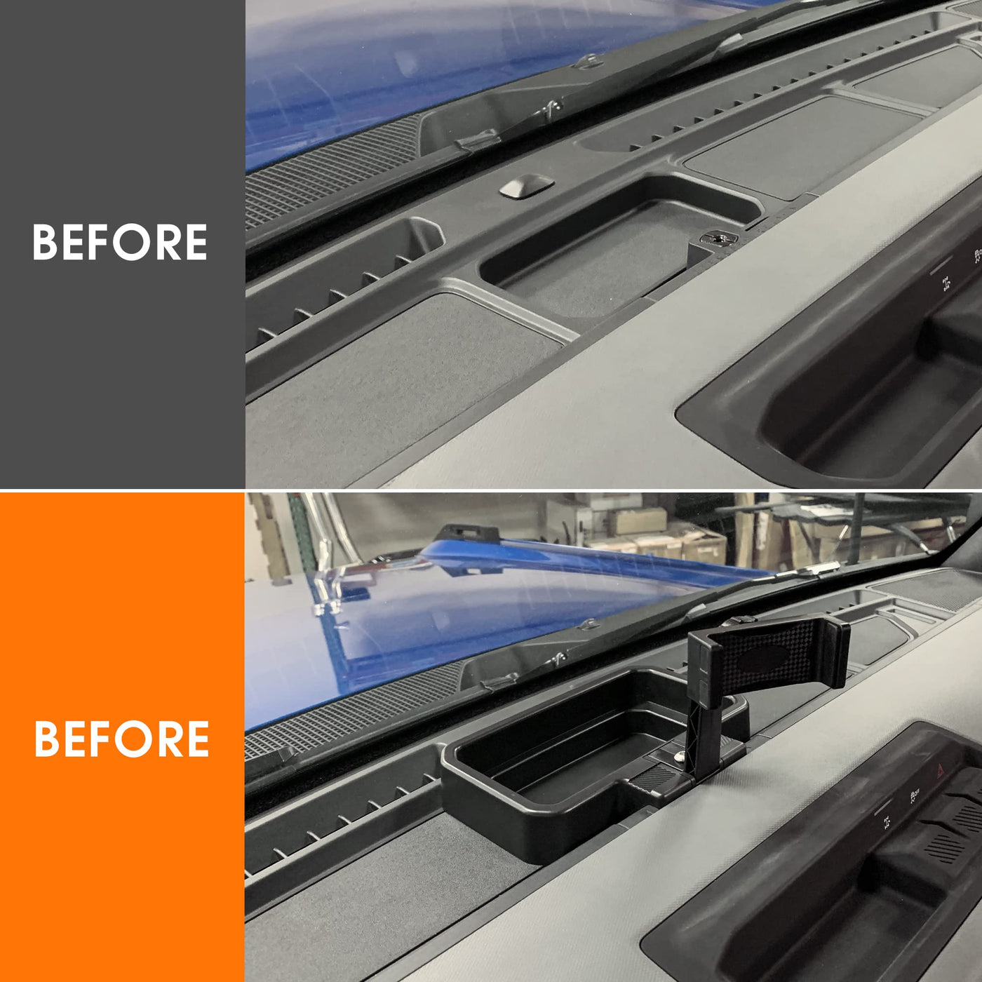 RERPRO Dash Mount Phone Holder for 2021 2022 2023 2024 2025 Ford Bronco 2 Door 4 Door Accessories FITMENT Friendly for thick shell, compatible with 4in-7in phone The dash mount phone holder is customized for 2021 2022 2023 2024 2025 Ford Bronco 2 Door 4 Door interior accessories NOTE: Not for Bronco Sport WHAT YOU GET 1x dashboard phone holder for 2021 2022 2023 2024 2025 Ford Bronco 360ROTATING The phone holder for Bronco adopts a ball mount support and can be 360 adjusted, which provides you a great experience and satisfy your driving needs. EASY INSTALLATION No drilling or any modification. Just need to tighten the phone holer with a screw. The phone stand with storage tray will stay firmly.