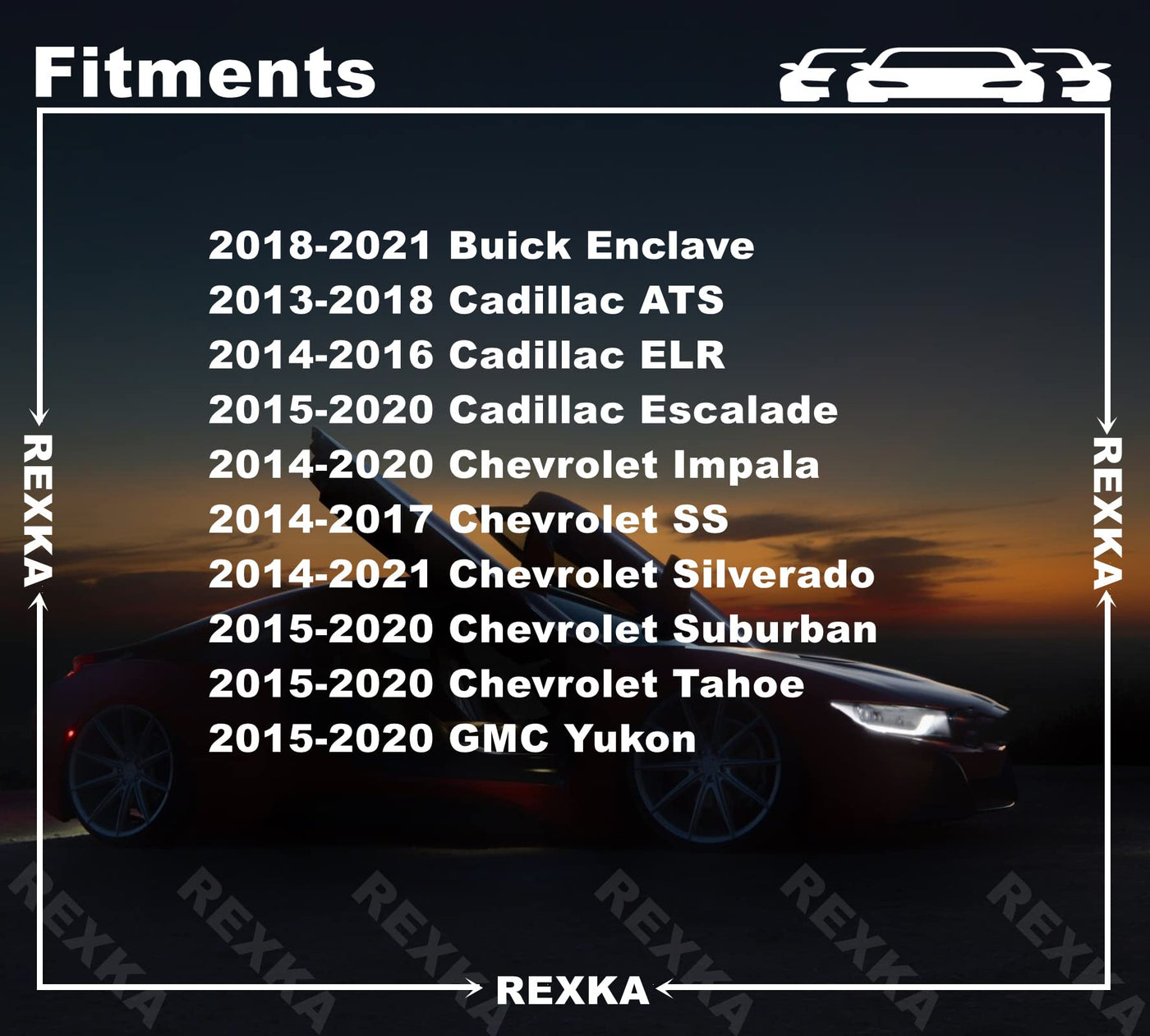 Q: What vehicles are compatible with the Rexka Body Side Moulding Clips?A: The Rexka Body Side Moulding Clips are compatible with a variety of GM vehicles including the 2018-2022 Buick Enclave, 2013-2018 Cadillac ATS, 2014 Cadillac ELR, 2015-2020 Cadillac Escalade ESV, 2014-2020 Chevrolet Impala, 2014-2017 Chevrolet SS, and various models of the Chevrolet Silverado from 2014 onwards.
