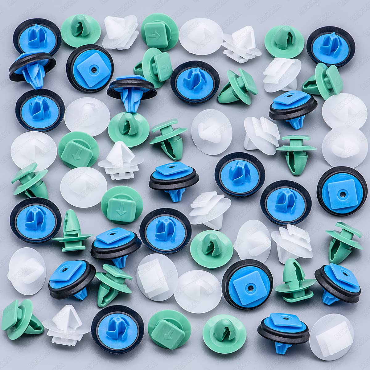 Q: How many clips are included in the kit, and what sizes do they come in?A: The kit includes a total of 60 clips divided into three types: 20 Blue Nylon Trim Clips, 20 Green Nylon Trim Flare Molding Attaching Clips, and 20 White Nylon Trim Clips. Sizes vary, with top head sizes ranging from 8mm x 10mm to 12mm square.