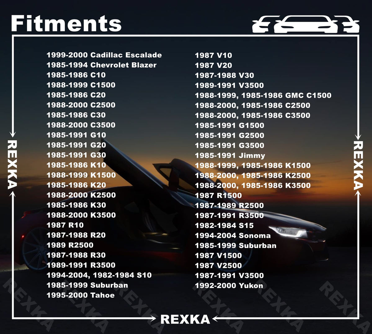 Q: What vehicles are compatible with the Rexka Tailgate Handle Lock Rod Retainer Clip?A: The Rexka Tailgate Handle Lock Rod Retainer Clip is compatible with various GM and Chevy models, including C1500, C2500, C3500, K1500, K2500, K3500, and S10, as well as GMC models like C1500, C2500, C3500, K1500, K2500, K3500, and Sonoma.