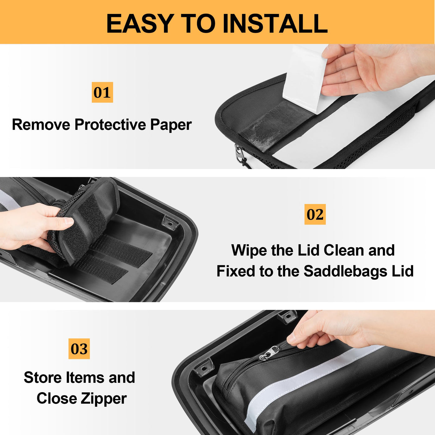 Q: Are the Rexmica Saddlebag Lid Organizers easy to install?A: Yes, these saddlebag lid organizers come with 2 hook and loop fastener strips that are 1.5 inches wide, ensuring a secure and easy installation on your motorcycle's saddlebag lids.