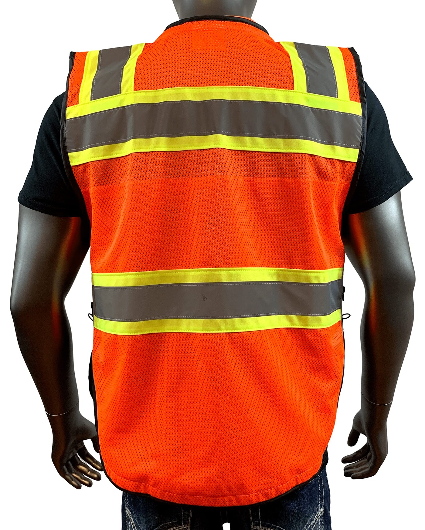 Features and Specs: Solid polyester front with mesh back. Heavy duty black bottom and trim to help keep a clean appearance. Zipper front closure reinforced with durable webbing. 2 wide high performance reflective material laminated to 3 contrasting color. Left and right mic tabs. 2 lapel grommets. Padded neck for comfort. Pockets: Left chest 2-tier pocket with dual function flap that can be held open by hook & loop. Large right gusseted pocket with flap. Outside lower front pockets with flaps, left and right stake pockets, left and right elastic spray paint can pockets. Lower inside right full length zipper pocket with load-bearing strap. Lower inside left tablet pocket with load-bearing strap. Hidden back pouch with left and right zipper access.