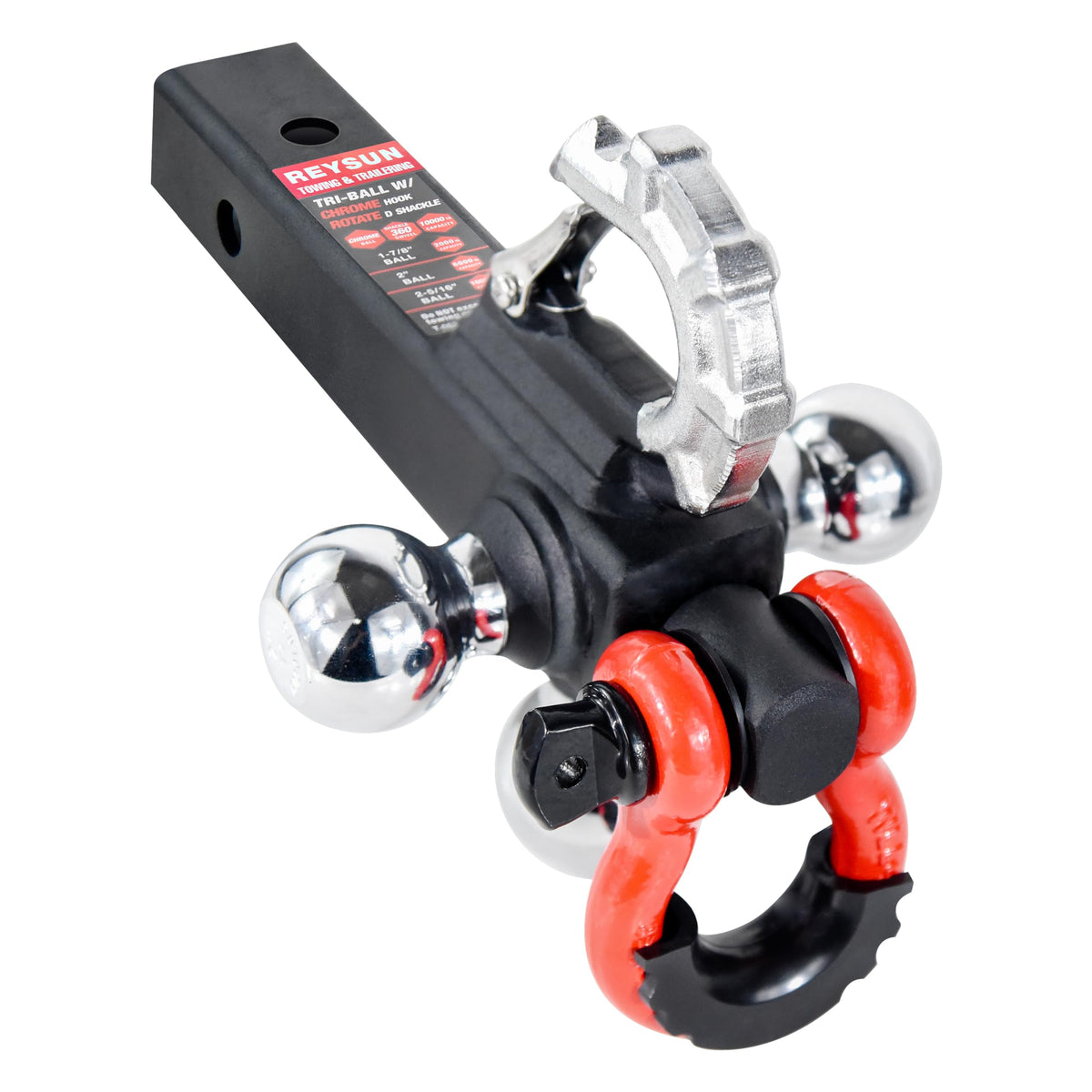 Reysun Trailer Hitch Tri-Ball Mount: With Swivel Tow Shackle And Tow Hook, Fits For 2-Inch Receiver, Chrome Trailer Ball Size 1-