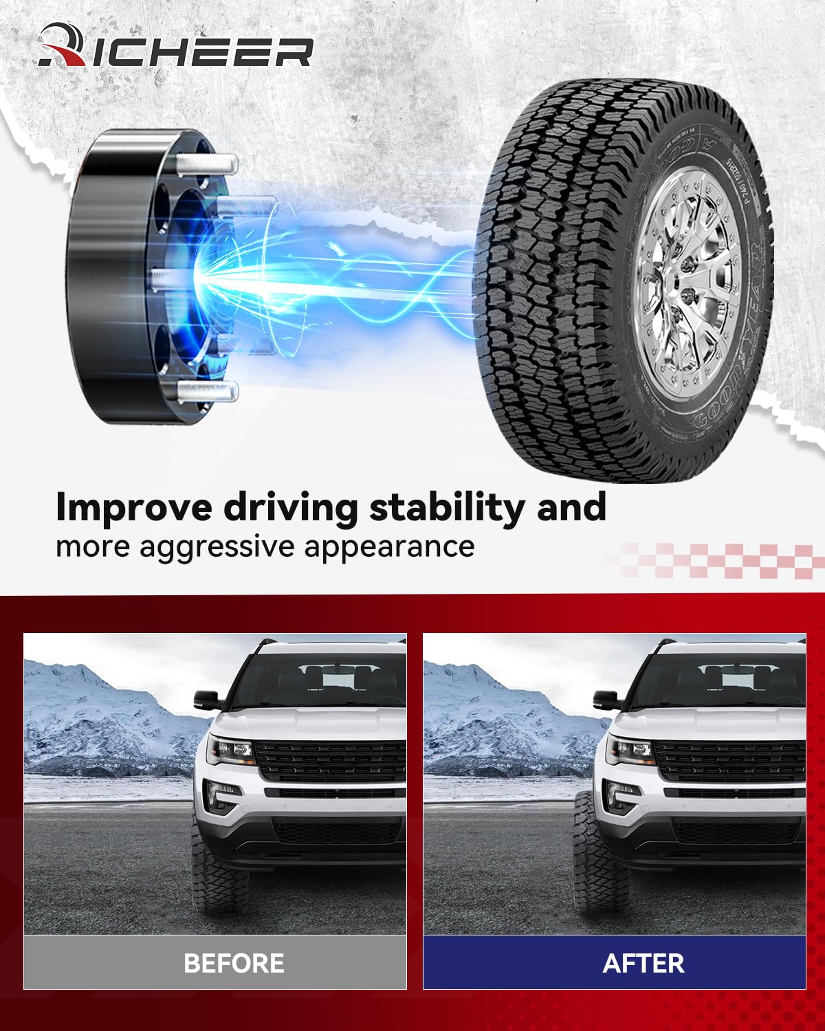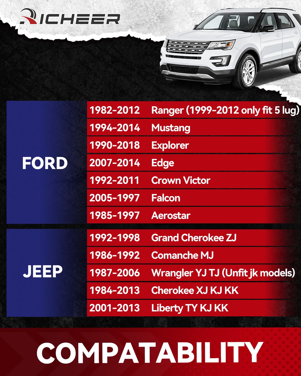 Compatibility: 1982-2012 Ranger (1999-2012 only fit 5 lug); 1992-1998 Grand Cherokee ZJ; 1986-1992 Comanche MJ; 1987-2006 Wrangler YJ TJ (Unfit jk models); 1984-2013 Cherokee XJ KJ KK; 2001-2013 Liberty TY KJ KK; 1986-1992 Comanche; 1994-2014 Mustang, 1990-2018 Explorer; 2007-2014 Edge; 1992-2011 Crown Victor; 2005-2017 Falcon; 1985-1997 Aerostar|Specification: Set of 4. 2 Thickness; 5x4.5 to 5x4.5 Bolt Pattern; 82.5 mm Hub Bore; 1/2x20 Threaded Studs/Nuts|High Tensile Strength: The Grade 12.9 stud can reach a tensile strength of 1000MPa, which has higher tensile strength and yield strength than the 10.9 stud, providing better structural support and safety|Superior Performance: The wheels are made of high-quality forged 6061-T6 billet aluminum alloy and CNC precision machining, and the surface anodized coating can also protect the metal surface from environmental erosion under extreme conditions|Benefit: The wheel spacers provide extra width for the wheel track to bring an aggressive appearance, and with the improvement of traction, the vehicle's anti-roll performance and handling comfort have been greatly improved|Package Includes: 4 x hubcentric wheel spacers (2 per unit), 2 x high strength thread-locking (red), user manual|Brand Services: All Richeer wheel spacers are covered by 2 years
