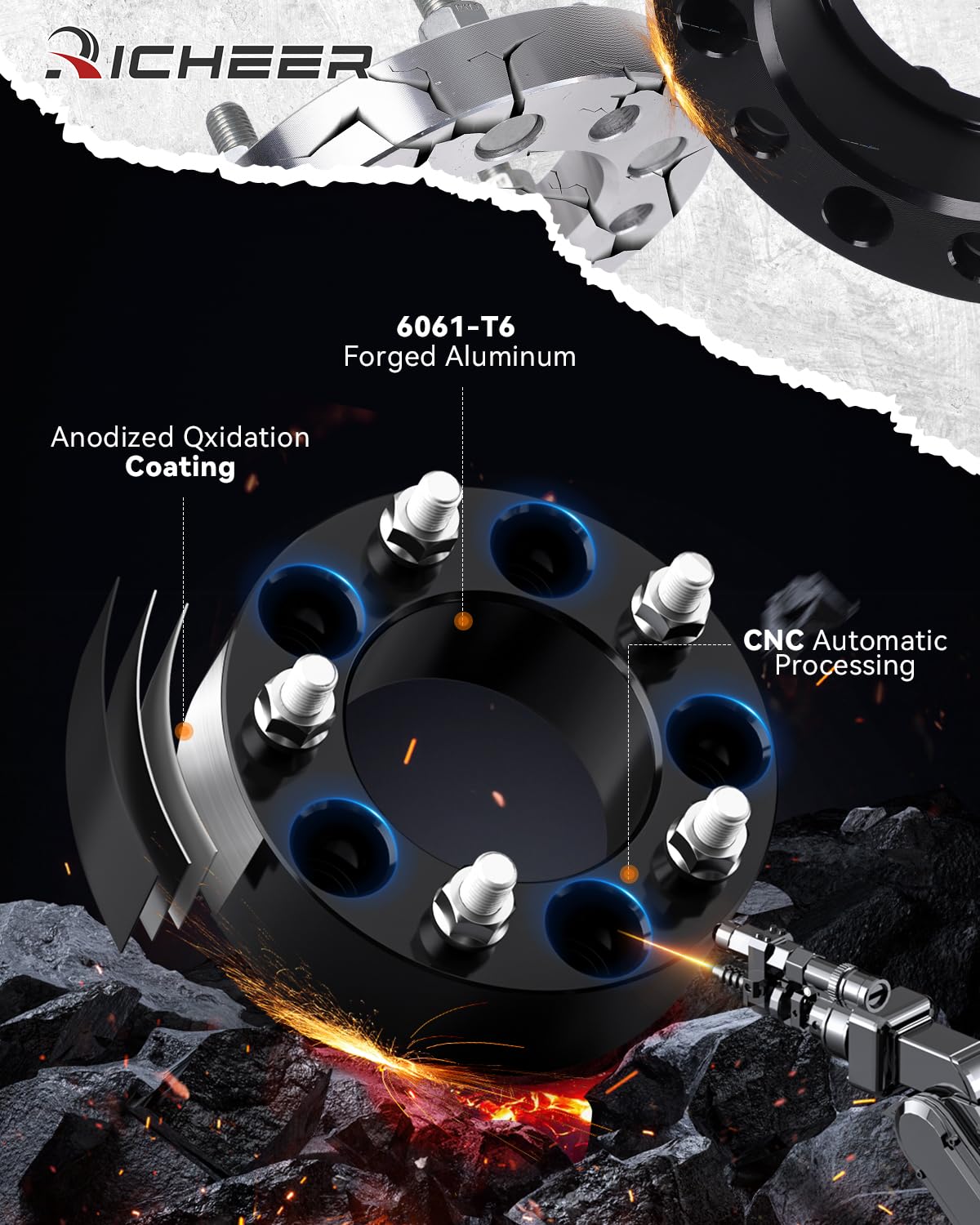 Q: What material is used in the Richeer Wheel Spacers?A: The Richeer Wheel Spacers are made from high-quality forged 6061-T6 billet aluminum alloy, ensuring durability and strength. They also feature a CNC precision machining process and a surface anodized coating to protect against environmental erosion, making them suitable for extreme conditions.
