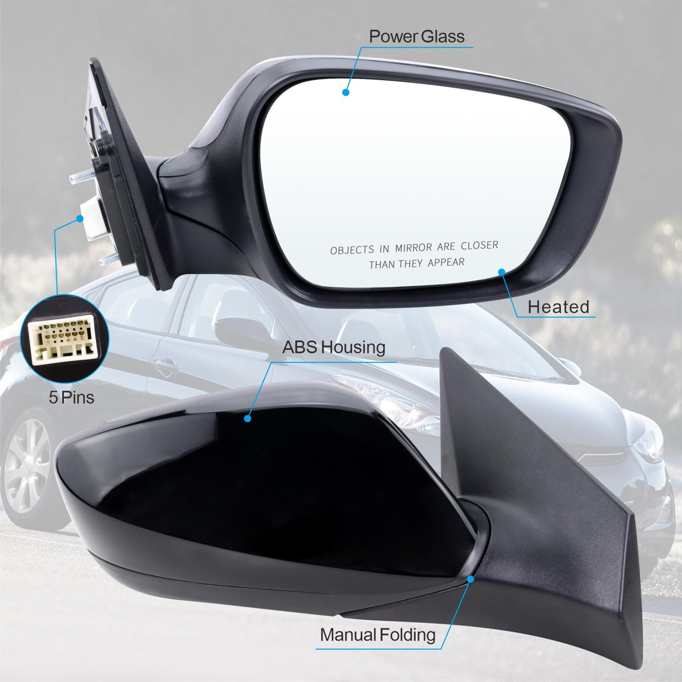 Right Passenger Side Mirror Compatible With 2011 2012 2013 Hyundai Elantra With Manual folding Power Glass Heated Black Replace#