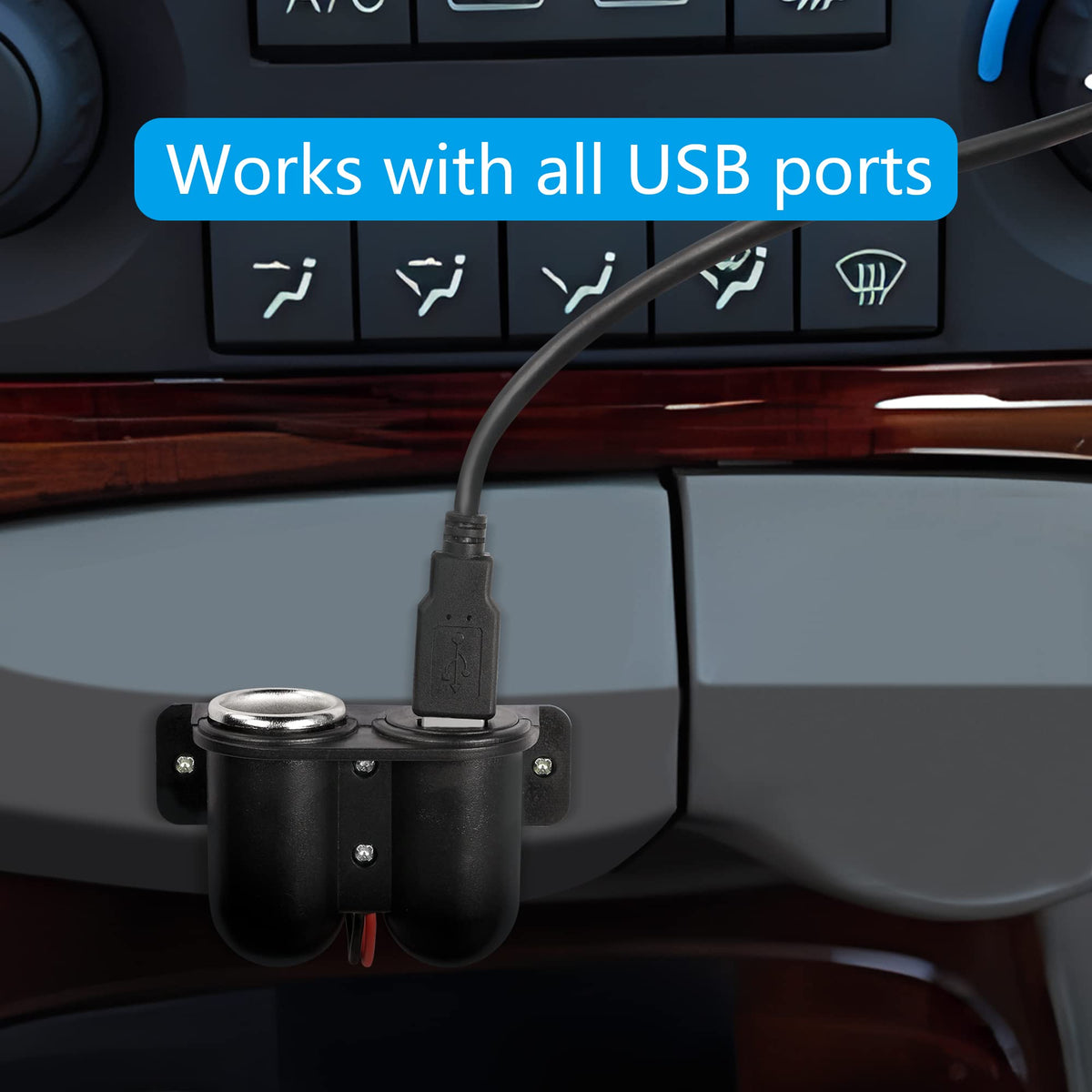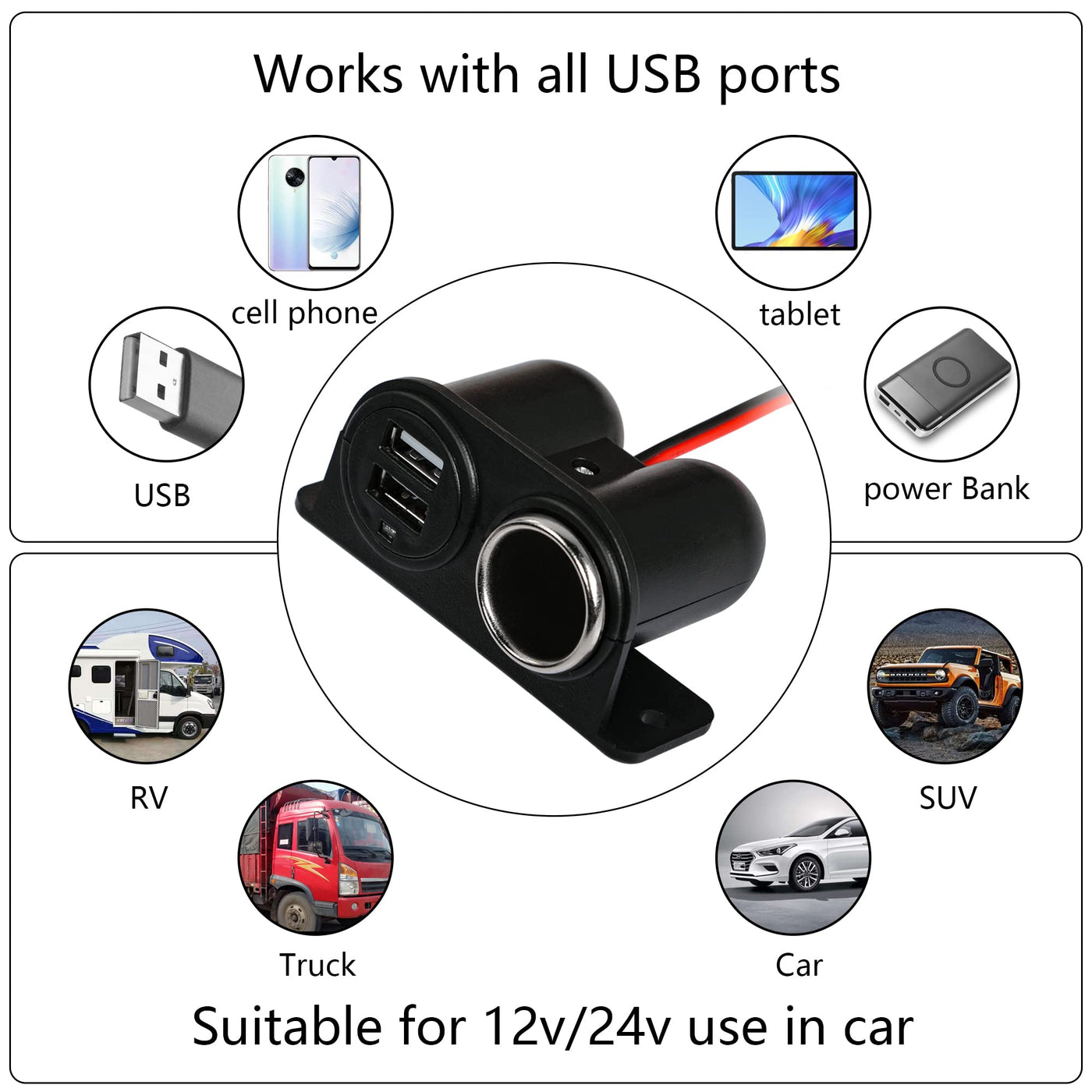 12v USB cigarette lighter outlet, with 2 USB power outlet, suitable for 12-24V vehicle power supply equipment, such as cars,truck, motorcycles, RVs, boats, ATVs, etc. compatible with all USB devices, 2 USB ports can be used at the same time, perfect for mobile phone, tablet, game console, camera, GPS, dash cam, etc.to meet your daily needs. Features: 1.A cigarette lighter is divided into 2 USB port, which can be used at the same time 2.Compatible with 12-24V car power supply use, Compatible USB port use. 3.Environmentally friendly flame-retardant materials,temperature resistance, high current resistance, abrasion resistance, etc features. 4.Simple installation and convenient fixing Specification: Working voltage: 12V/24V USB port: 2.0A Cable length: 20cm Material: rubber and metal Colour: Black The package includes: 1Pcs X 12V cigarette lighter socket power 2Pcs X Screws