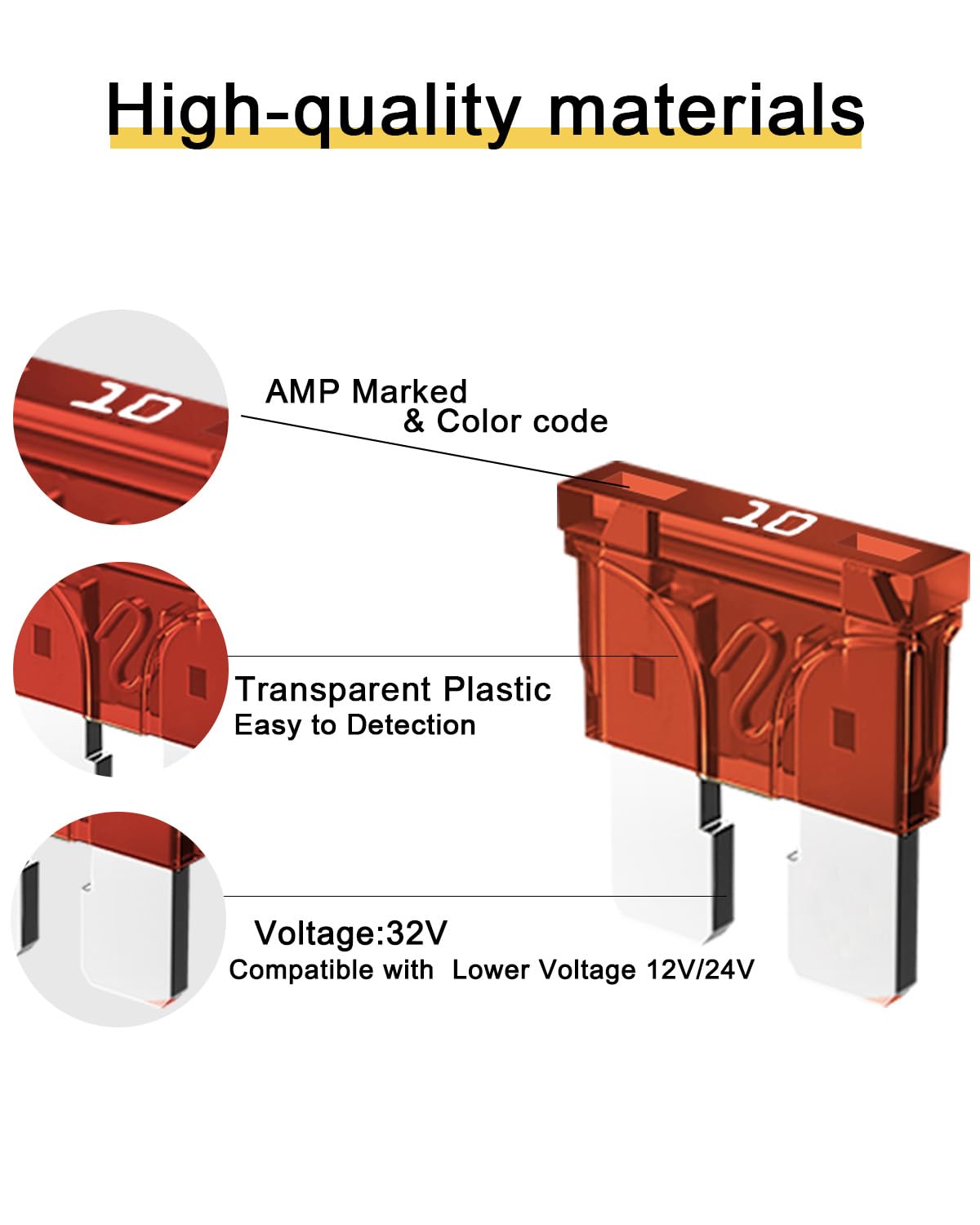 Easy To Identity - Amplifier rating is clearly indicated in white, allowing you to easily read the amp rating, and their transparent housing ensures easy inspection. | Freely Choose - 20pcs Standard car fuses of the same current per pack, this item is 10 amp car fuse. You can freely match your need for AMP fuse. Avoid that some AMP car fuses are not enough, others are completely useless. | Small Tools, Great Use - These 10 amp automotive fuses will blow when the current is overloaded, which can protect your safety. It is used in many appliances such as cabin lamp, tail lamp, horn, air conditioning system, or other electronic products. | Widely Compatible - 10 amp fuses for RV, Automotive, Trucks, Motorcycle, Camper, SUV, Boat, automotive replacement fuses.10a Standard blade fuses are widely used in most German & EU brands cars to ensure electrical safety. | Product Details & Tips - Voltage:32V, Current: 10A, Size: Standard/Regular (This fuse can compatible with lower voltage 12V/24V, but the CURRENT and SIZE must be accurate, Check your desired size and current, which determines whether it can work.)