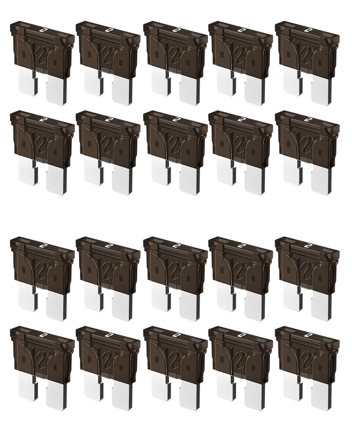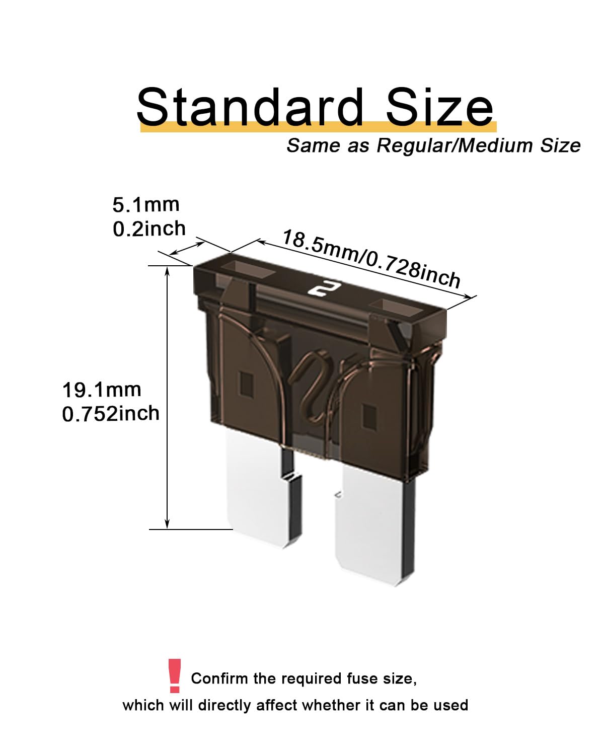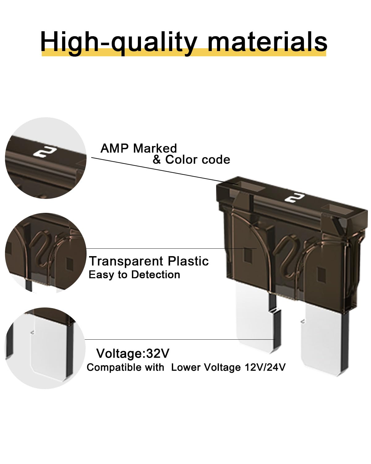 Freely Choose - 20pcs Standard car fuses of the same current per pack, this item is 2 amp car fuse. You can freely match your need for AMP fuse. Avoid that some AMP car fuses are not enough, others are completely useless. | Small Tools, Great Use - These 2 amp automotive fuses will blow when the current is overloaded, which can protect your safety. It is used in many appliances such as cabin lamp, tail lamp, horn, air conditioning system, or other electronic products. | Widely Compatible - 2 amp fuses for RV, Automotive, Trucks, Motorcycle, Camper, SUV, Boat, automotive replacement fuses.2a Standard blade fuses are widely used in most German & EU brands cars to ensure electrical safety. | Easy to Detectable - In addition to color-coded, the top of the fuse also has current and voltage markings, and their transparent housing ensures easy inspection. | Product Details & Tips - Voltage:32V, Current: 2A, Size: Standard/Regular (This fuse can compatible with lower voltage 12V/24V, but the CURRENT and SIZE must be accurate, Check your desired size and current, which determines whether it can work.)