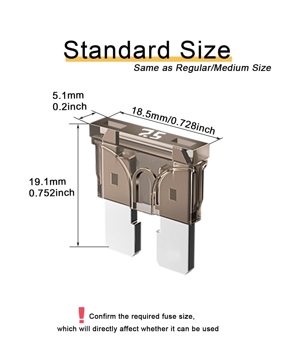 Easy To Identity - Amplifier rating is clearly indicated in white, allowing you to easily read the amp rating, and their transparent housing ensures easy inspection. | Freely Choose - 20pcs Standard car fuses of the same current per pack, this item is 7.5 amp car fuse. You can freely match your need for AMP fuse. Avoid that some AMP car fuses are not enough, others are completely useless. | Small Tools, Great Use - These 7.5 amp automotive fuses will blow when the current is overloaded, which can protect your safety. It is used in many appliances such as cabin lamp, tail lamp, horn, air conditioning system, or other electronic products. | Widely Compatible - 7.5 amp fuses for RV, Automotive, Trucks, Motorcycle, Camper, SUV, Boat, automotive replacement fuses. 7.5a Standard blade fuses are widely used in most German & EU brands cars to ensure electrical safety. | Product Details & Tips - Voltage:32V, Current: 7.5A, Size: Standard/Regular (Compatible with lower voltage 12V/24V, but the CURRENT and SIZE must be accurate, check your desired size and current, which determines whether it can work.)