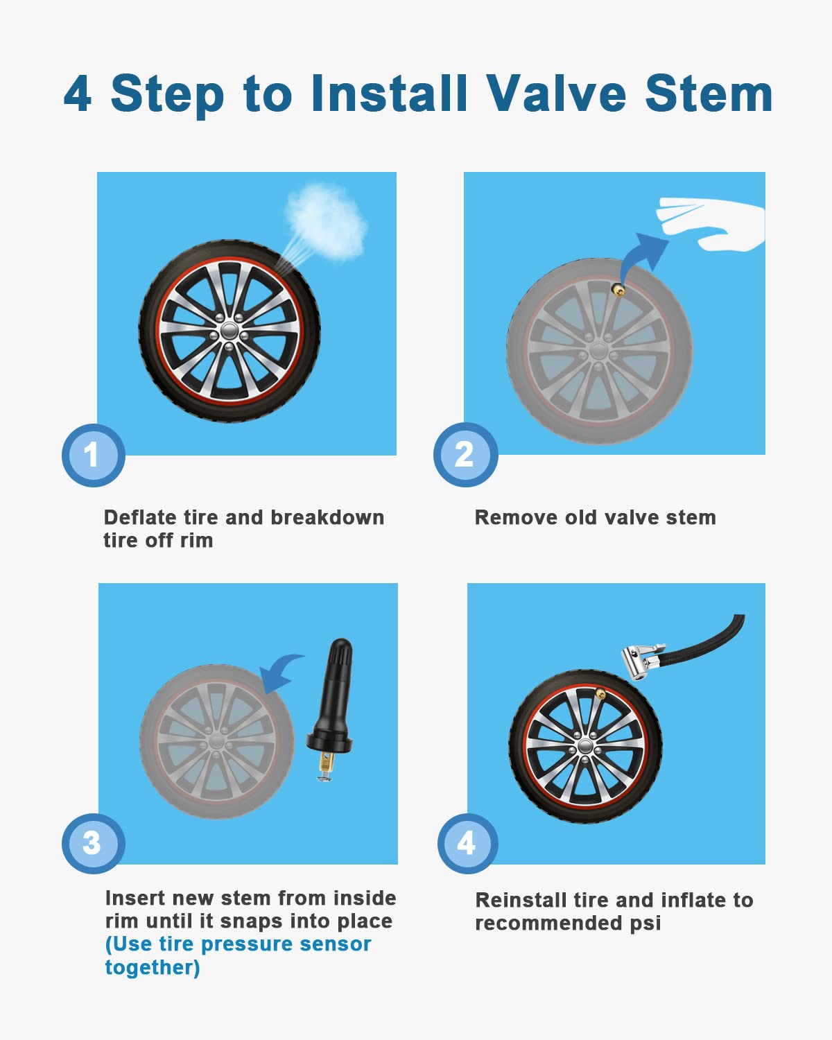 When replacing a tire, a tire technician should always replace the valve stem to ensure there are no issues with the tire changing process. Valve stems over time will age which could cause a flat tire. Features & Specs 5pcs Black tubeless tire valves For TPMS 20008 tires .453 rim hole 1-1/2'' long How to Use 1. Deflate tire and breakdown tire off rim 2. Remove old valve stem 3. Insert new stem from inside rim until it snaps into place 4. Reinstall tire and inflate to recommended psi''