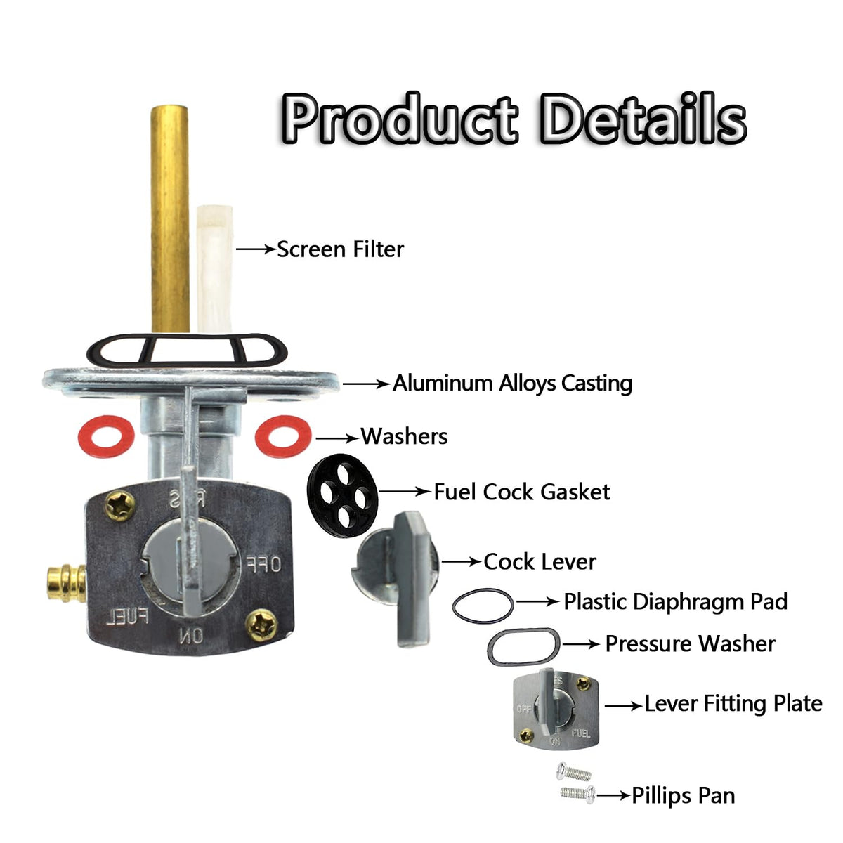 ATV Fuel Gas Tank Petcock Valve with Lever Screw for Yamaha YFS200 YFM250 YFM350 YFM400 YFM600 YFM660 YFZ350 YFZ450 Suzuki DRZ400 FZR600 LT80 LTZ250 LTZ400 Raptor 660 Wolverine Banshee Specification: Condition: New Gold Tone Part Height: 4.8cm / 1.89'' White Part Height: 2.9cm / 1.14'' Gold Tone Hole Inner Diameter: 6.3mm / 0.16'' Installation Hole Diameter: 6.3mm / 0.25'' Red,Black Gasket Diameter: 11.5mm / 0.45'' Fuel Hose Length: 31cm / 12.2'' Fitment Type: Direct replacement Feature: Type: Fuel Petcock For Yamaha Work as a gasoline line switch, can help to control the daily work of the fuel tank. It can completely close the fuel tank to prevent the oil from evaporating Fit for Suzuki LTZ 250 LTZ400 LTZ400Z 2003-2008 DR 200 1986-1987 DR 250 1990-1995 DR350 DR350S DR350SE 1990-1999 DRZ400E DRZ400S DRZ400M 2000-2003 KING QUAD 300 1992-2000 Fit for Yamaha TTR 90 125 230 250 2000-2011 Kodiak 400 YFM 400 1993-1999 Kodiak 450 YFM450 2003-2006 XVS1100 V-Star 2001-2008 Banshee 350 YFZ350 1987-2006 WARRIOR 350 YFM350 1987-2004 Wolverine 350 1995-2005 Raptor 660 2001-2005 Timberwolf 250 YFB2