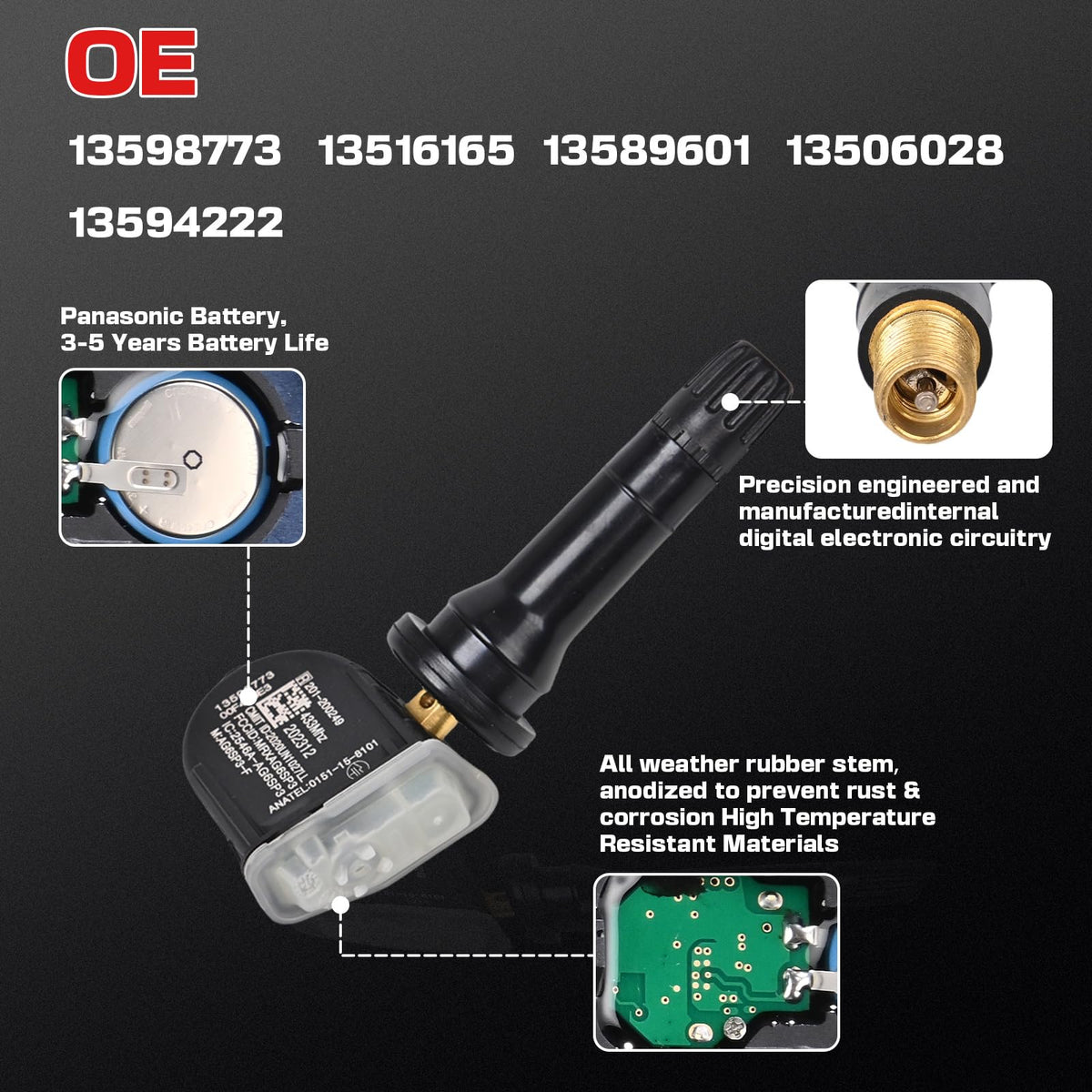 What Are The Benefits Of TPMS?TPMS stands for Tire Pressure Monitoring System. Its a safety system built into your vehicle that monitors your tire pressure, and alerts you when the pressure in one or more tires falls to an unacceptable levels. Tire Pressure Monitoring System can increase your safety on the road by improving your vehicle's handling, decreasing tire wear, reducing braking distance and improving fuel efficiency. Specification: Condition: 100% Brand New and tested prior to leaving the factory High Quality: Built to strict quality control standards, High Quality OEM Replacement Part Package Contents: 4 * Tire Pressure Monitoring System SensorReplaces Part Numbers: 13598773 13516165 13589601 13506028 13594222Tire Pressure Monitoring Sensor(TPMS) Compatible with below vehicles: 2013-2023 GMC Acadia 2016-2024 GMC Savana 2500 2016-2024 GMC Savana 3500 2012-2020 GMC Terrain 2016-2023 GMC Sierra 2016-2021 GMC Yukon 2019-2023 Encore 2013-2022 Enclave 2017-2023 Regal 2016-2023 Lacrosse 2016-2023 Cadillac CT6