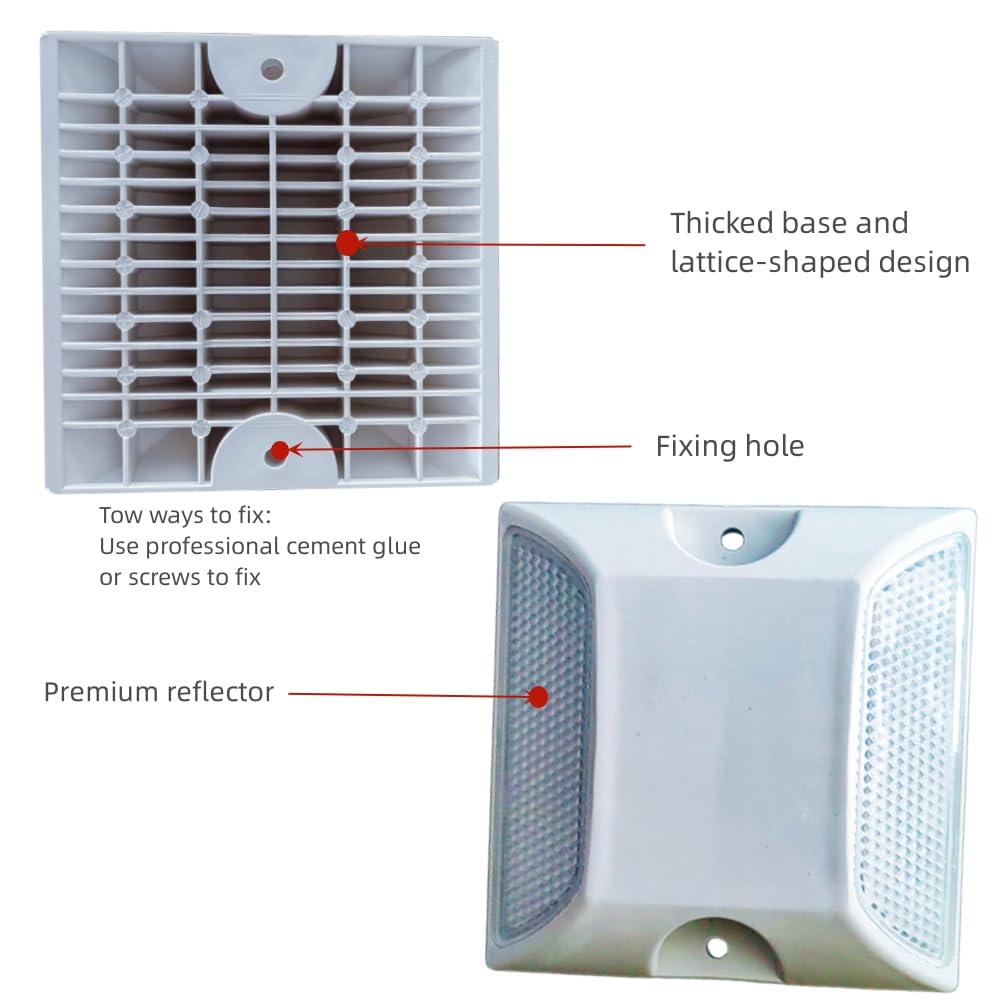 Q: What materials are the road reflectors made of?A: The road reflectors are made from premium ABS (Acrylonitrile Butadiene Styrene) material, which provides high resistance to temperature, water, oil, chemicals, and corrosion.