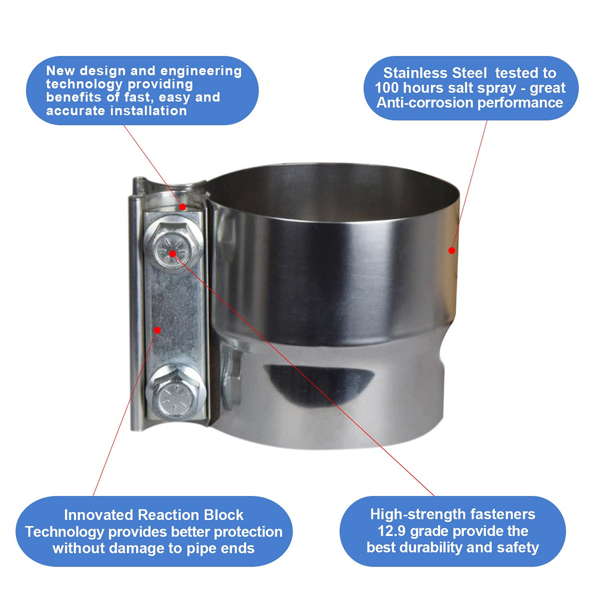 Q: Is this exhaust clamp durable and corrosion-resistant?A: Yes, the clamp is made from high-quality stainless steel and has been tested for over 100 hours in salt spray to ensure excellent anti-corrosion performance and long-lasting durability.