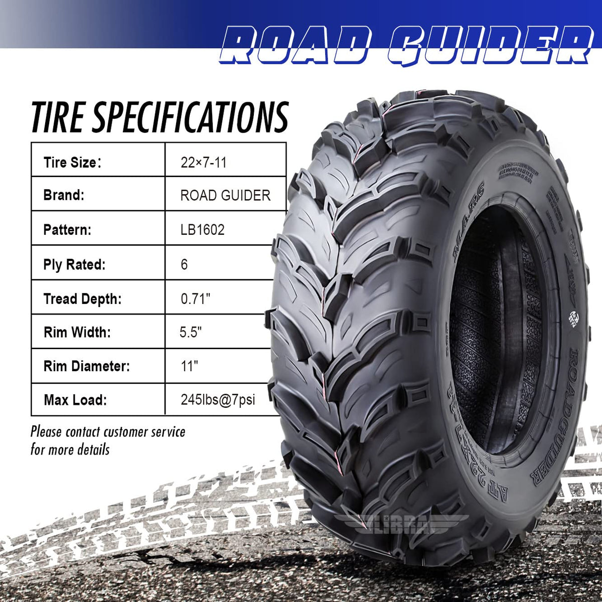 Set 2 front tire compatible for Honda 250 Suzuki Ozark 250. Dynamic tread patter provides exceptional acceleration and traction. Versatile tread patterns perform well in soft to hard pack conditions . Lug design provides better braking control. Heavy 6 ply rated construction resists punctures and abrasions. Tires only, wheels not includedTire SpecificationsTire Size: 22x7-11Brand: Road GuiderTread Pattern: LB1602Ply Rated: 6Tread Depth: 0.71Rim Width: 5.5''Max Load: 245lbs@7psiPlease note: fitment guide is for reference only and does not guarantee the tire will fit your specific model. Please check your owner's manual to ensure proper fitment.