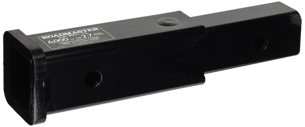 Q: What are the weight limits for the Roadmaster 07175 Receiver Extension?A: This receiver extension is rated for a maximum Gross Vehicle Weight Rating (GVWR) of 6,000 pounds and a maximum tongue weight of 100 pounds, ensuring safe towing capabilities.