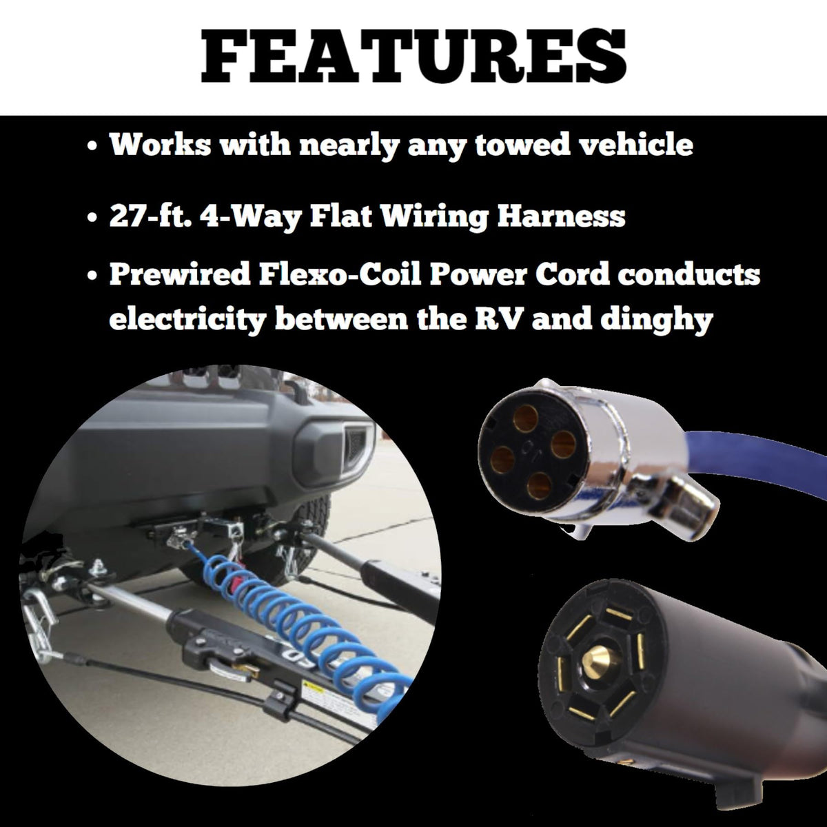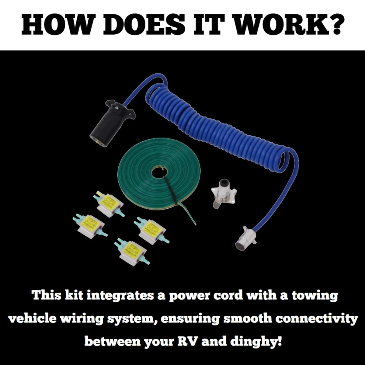 Q: What length of wiring harness is included in this kit?A: The Roadmaster 15247 kit includes a generous 27-foot length of a four-way flat wiring harness, providing ample length for connecting your RV to the dinghy.